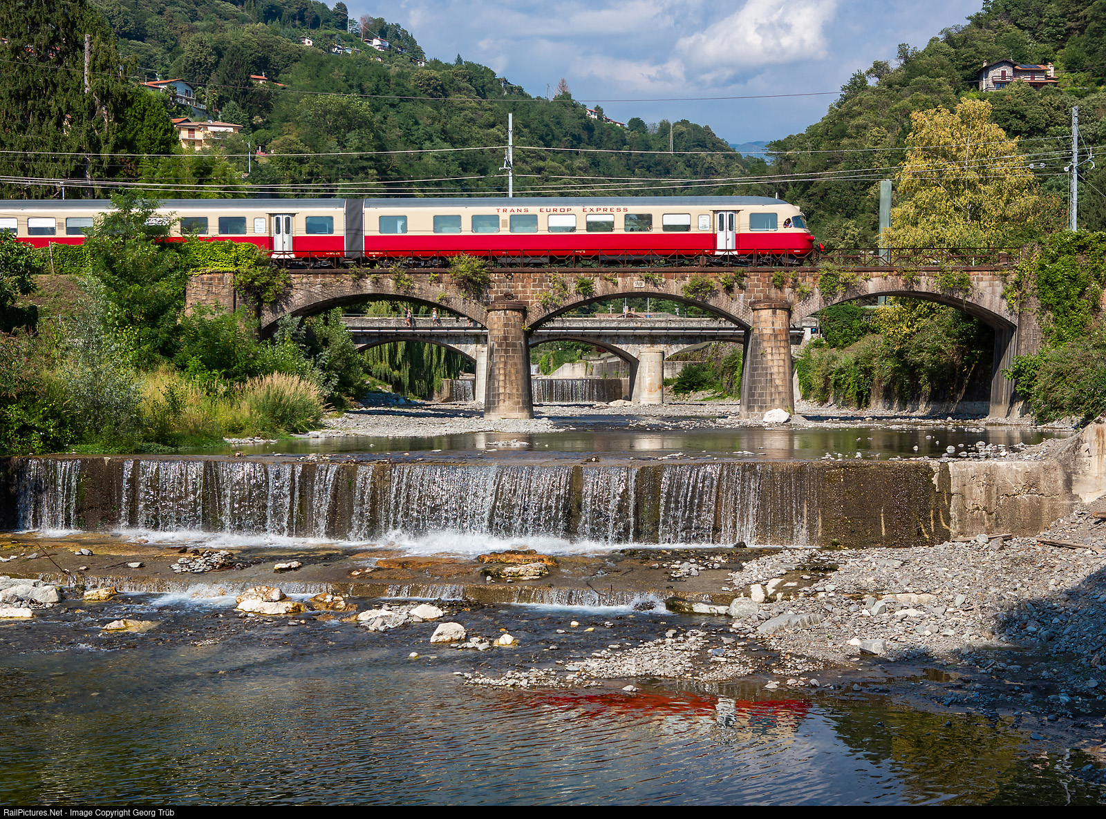 On the very first publicly advertised trip after the large techincal revision, the red/cream "TRANS EUROP EXPRESS", the RAe TEE II # 1053 trainset of SBB Historic made a journey from Zürich via the Gotthard line to Luino in Italy. The elegant trainset, dating from 1961, is on the way back now and just crossing the bridge over the Giona river in Maccagno/Italy. Sadly, the RAe TEE II isn't allowed any more to run in Italy, France, Germany, Luxembourg, Belgium, Netherlands and Austria like in old days, but the line to Luino is an SBB line!