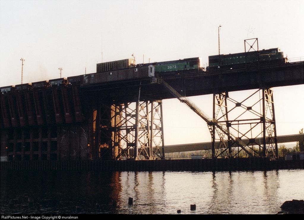 Late evening sun glints off of the dock approach as 3000 and sister 3073 (C30-7) pull ore hoppers off the dock