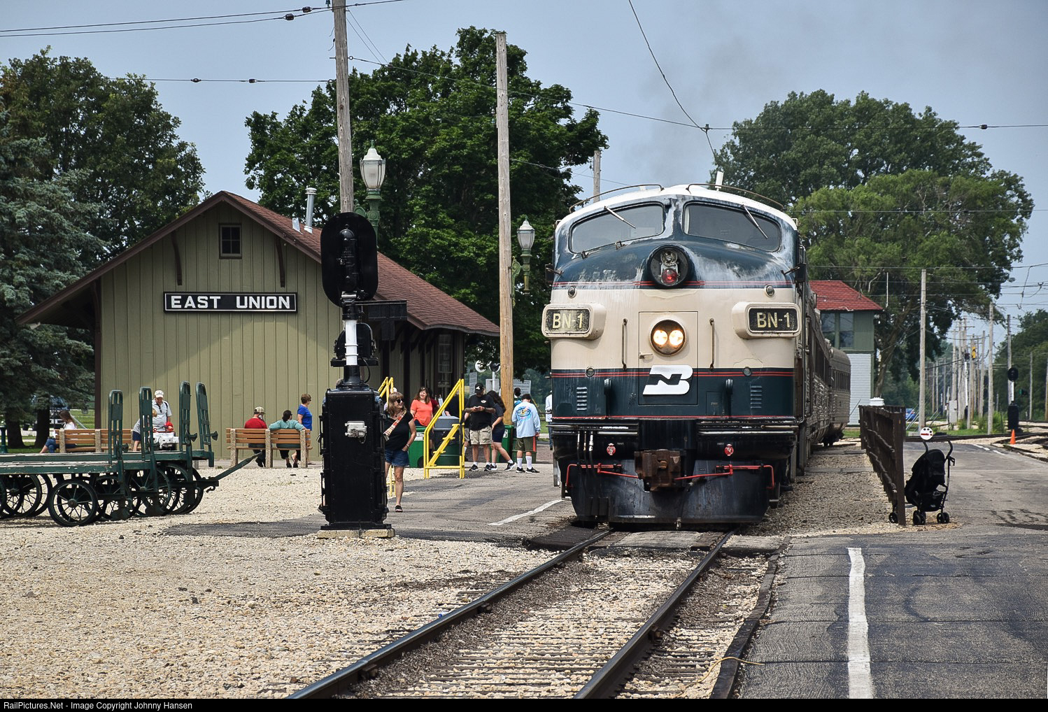 BN 1 holds at East Union depot with the Nebraska Zeyphr train set as it waits for the coach train to clear East Switch before proceeding east down the mainline to Kishwaukee Grove.