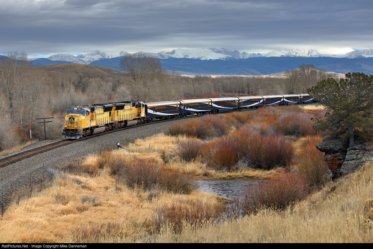 A pair of Union Pacific EMD SD70Ms, wrapped and patched for Rocky Mountaineer Railtours, powers the westbound luxury train west out of Granby, Colorado, on November 14, 2021. The Continental Divide in the background has a fresh dusting of snow.