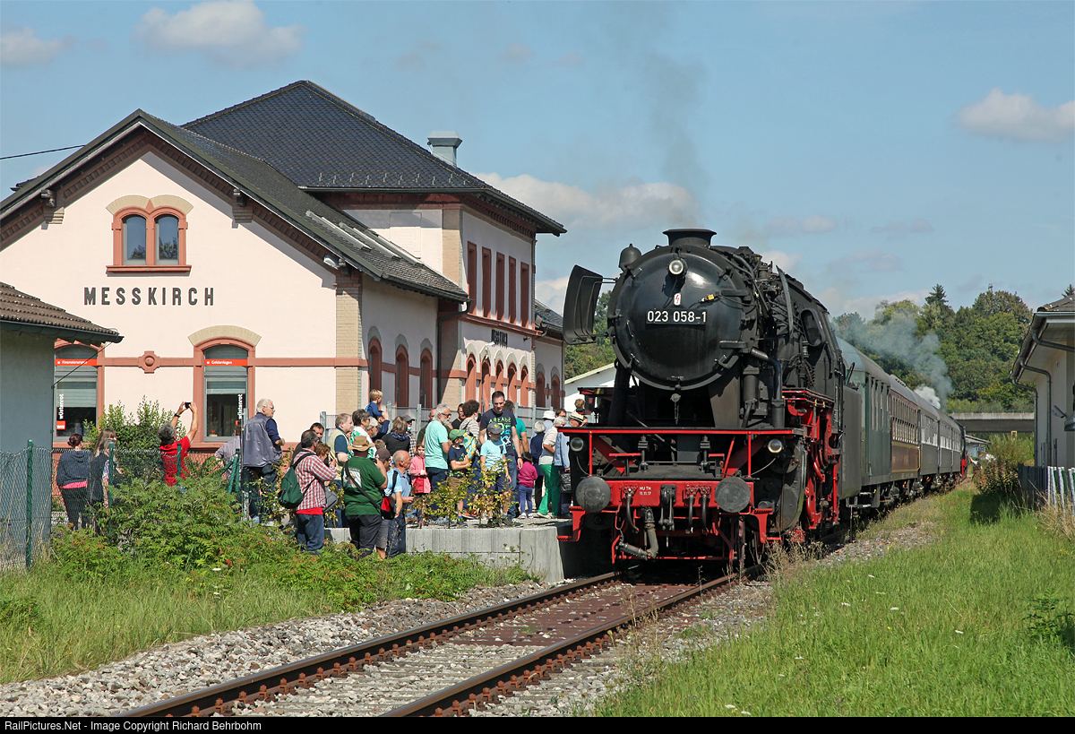 | The 2-6-2 steam locomotive 23 058 makes a stop with the "Ablachtal-Donautal-Express" in Messkirch. The "Ablachtarailway" from Stockach to Mengen was reopened in July 2021. |