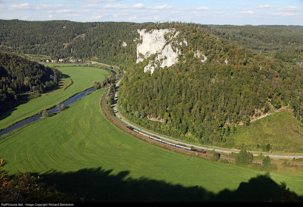 | The 2-6-2 steam locomotive 23 058 of Eurovapor, built in 1955 by Krupp, and at the rear the 2-10-0 steam locomotive 52 7596 of Eisenbahnfreunde Zollernbahnand built in 1944 by Wiener Lokfabrik Florisdorf (Austria) are en route with the "Ablachtal-Donautal-Express" in the Danube valley from Mengen to Tuttlingen. |