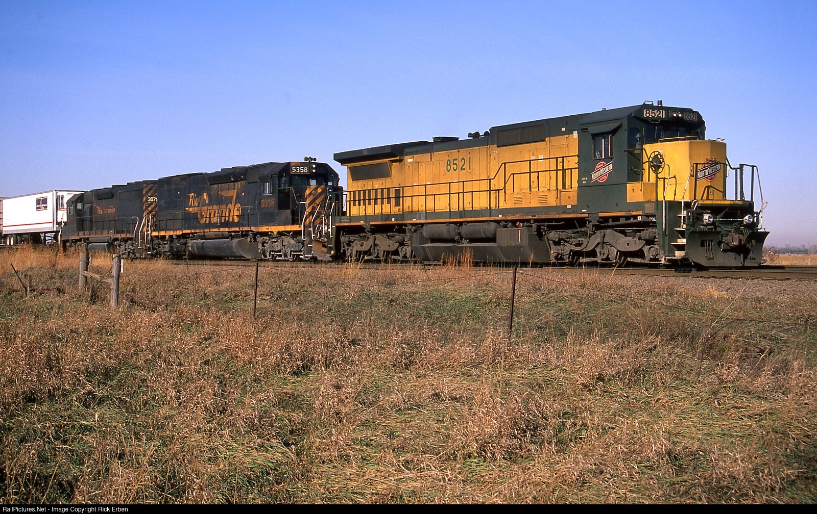 An eastbound departs Fremont, NE on its way to Chicago one autumn afternoon. Power in color schemes from the merged railroads was prevalent - in this case a pair of Rio Grande units - an SD40T-2 and GP40. The tunnel motors seldom reached eastern Nebraska owing to the dearth of tunnels in the region, but they always looked good.
