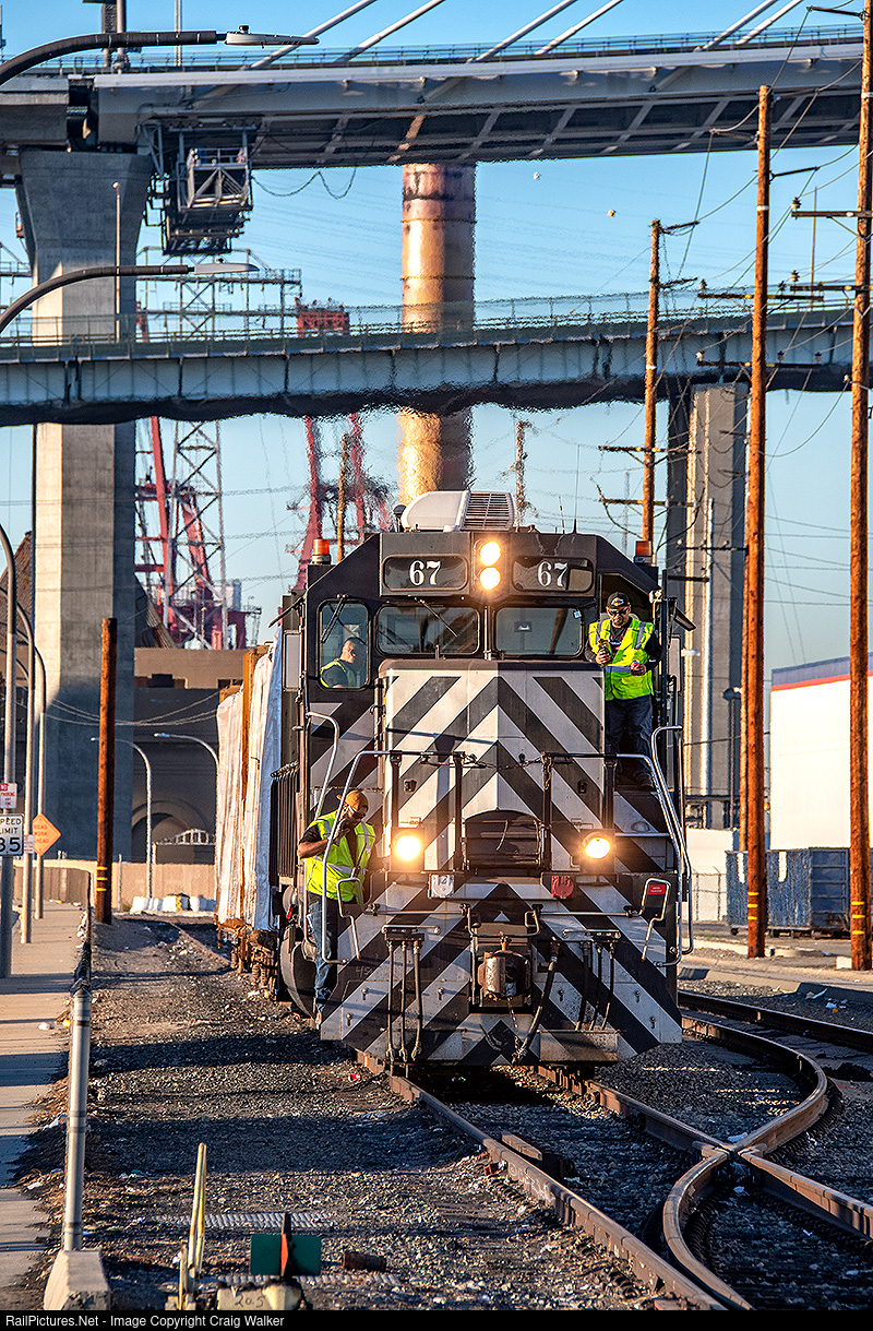 It is only 3:52 pm (15:52), but the sun is already low in the sky, and will set in another hour. Still, it is all good, as Pacific Harbor Line local YPSW14-27 rarely switches the Weyerhaeuser Lumber (Fremont Forest) facility while the sun is up, even in the "longer" days of summer, so this is a treat. PHL MP20C-3 67 is bringing in two loaded centerbeam bulkhead flats, to add to the three cars already being unloaded within the facility at the end of the Pier T Lead. Once the lumber has been delivered, PHL 67 will haul five ROGX hopper cars north. PHL 67 was built by MotivePower Inc. in December 2007, utilizing the frame from Southern Pacific SD40R 7361 (ex-SP SD40 8478) – notice the plate on the nose, where the SP lights used to be. As with all of PHL’s fleet, MP20C-3 locomotives have a cleaner exhaust them most diesels. Looming in the distance are the old, decommissioned Gerald Desmond Bridge (note the netting underneath its span, which catch chunks of concrete that were falling off of this 1968-built bridge), and behind it, the recently opened Long Beach International Gateway cable-stayed bridge with a clearance of 205 ft (62 m) above the waterline, which allows larger container ships to pass underneath then the older Gerald Desmond Bridge did. (Long Beach, California – November 27, 2021)