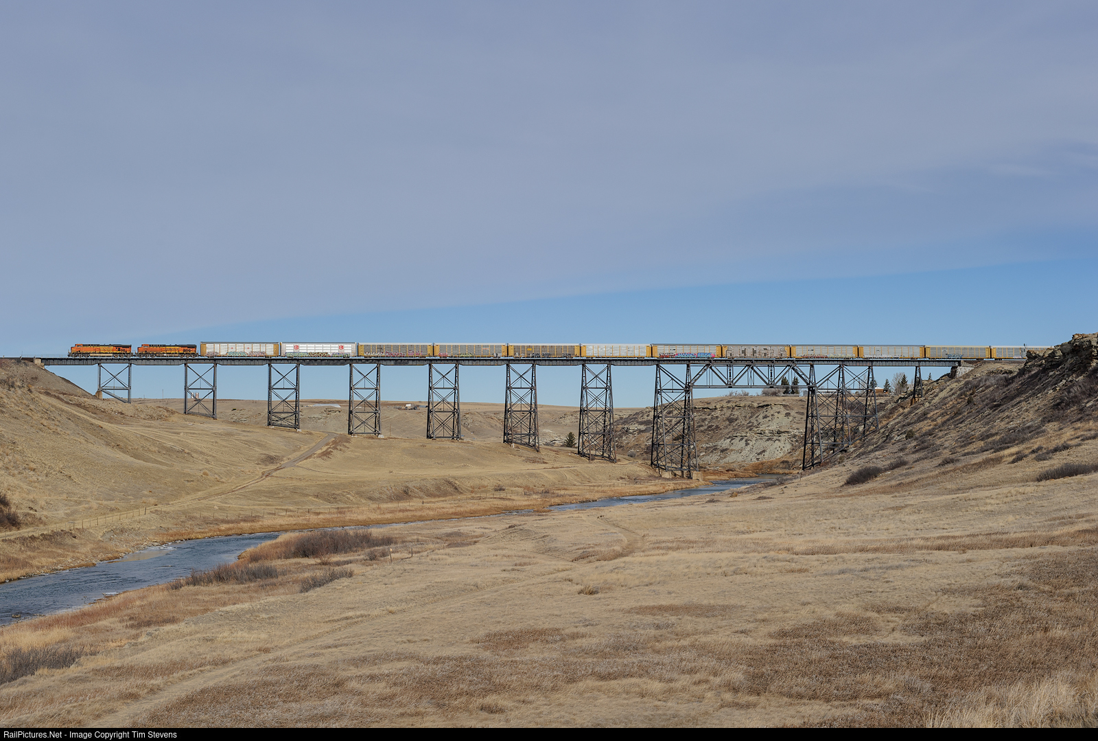 Portland bound autoracks cross the Cut Bank Creek on BNSF's Hi Line Sub.