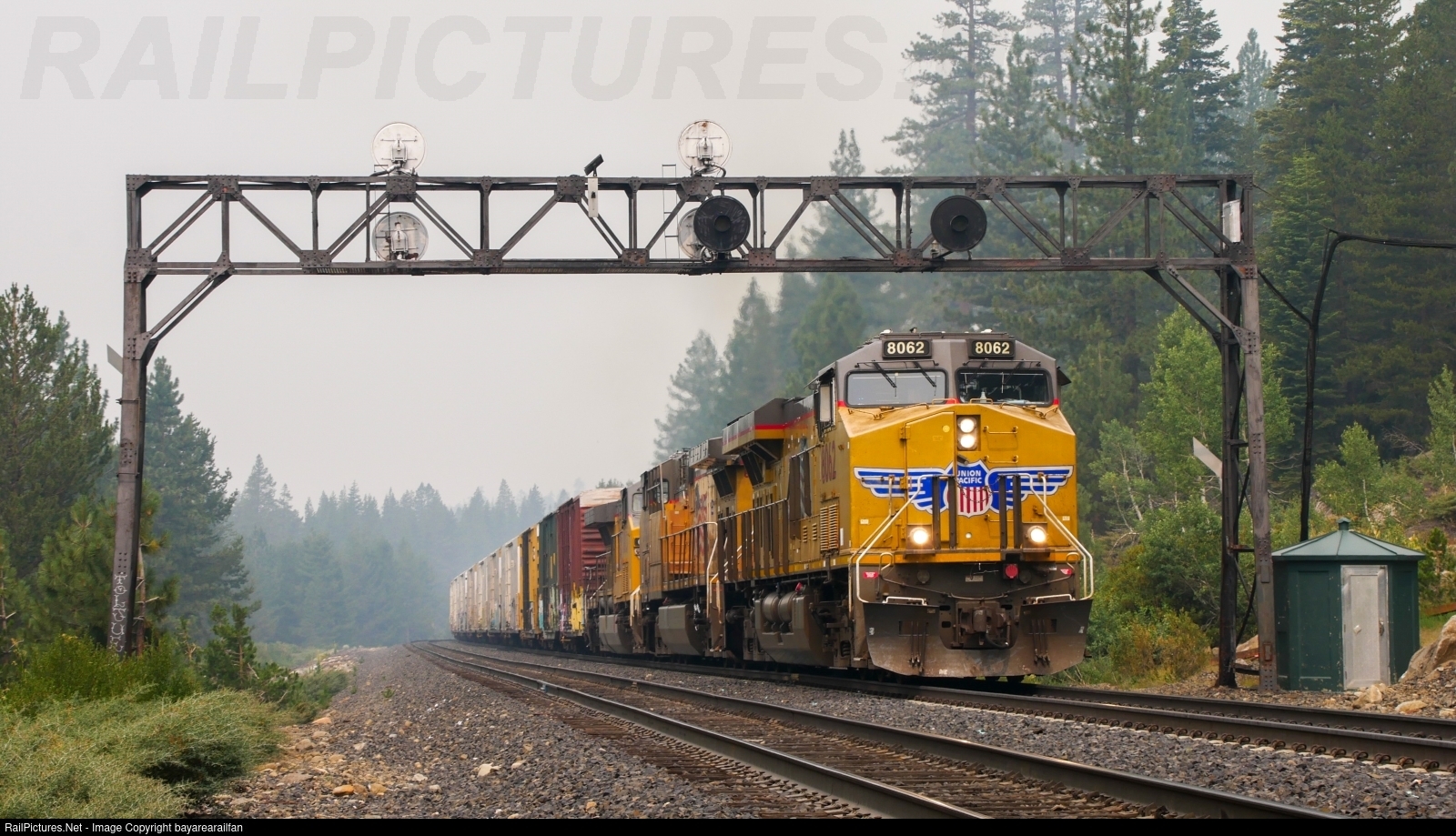 | Following a slow grind up the hill, an Oregon-bound manifest, rerouting across Donner Pass, passes underneath the iconic Norden searchlights. |