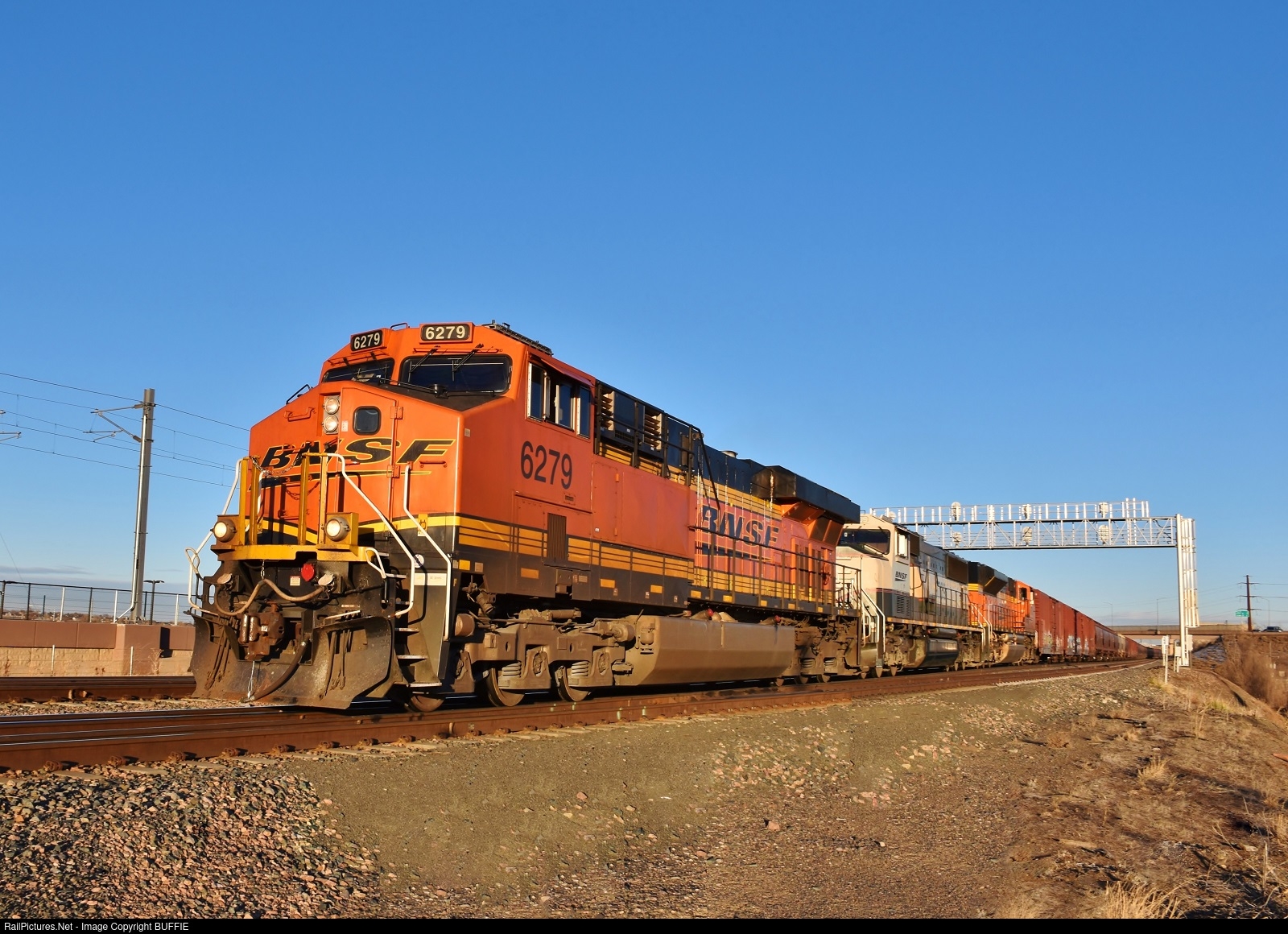 | BNSF 6279 (ES44AC) leads an Executive MAC and the beer train towards the Coors Brewery in Golden, Colorado. |