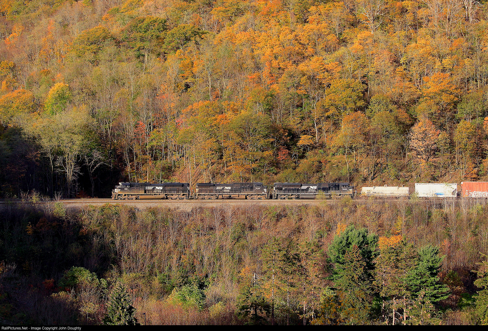 NS 1168 leads NS 4133, NS 7245 and a very long manifest train west around the Horseshoe Curve. The hills around the curve were full of fall colors, a spectacular sight to behold.