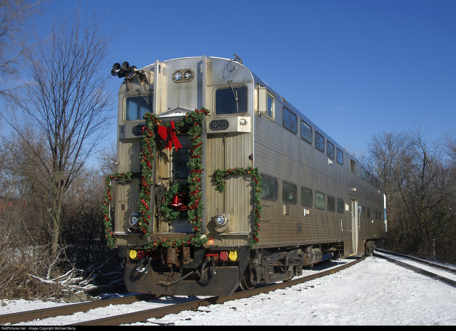 Cab car AMT 900 is decorated for its use in Exporail's Christmas Train as it heads to Des Bouleaux Station on the first run of the morning. The gallery cab car was donated to the museum earlier this year.