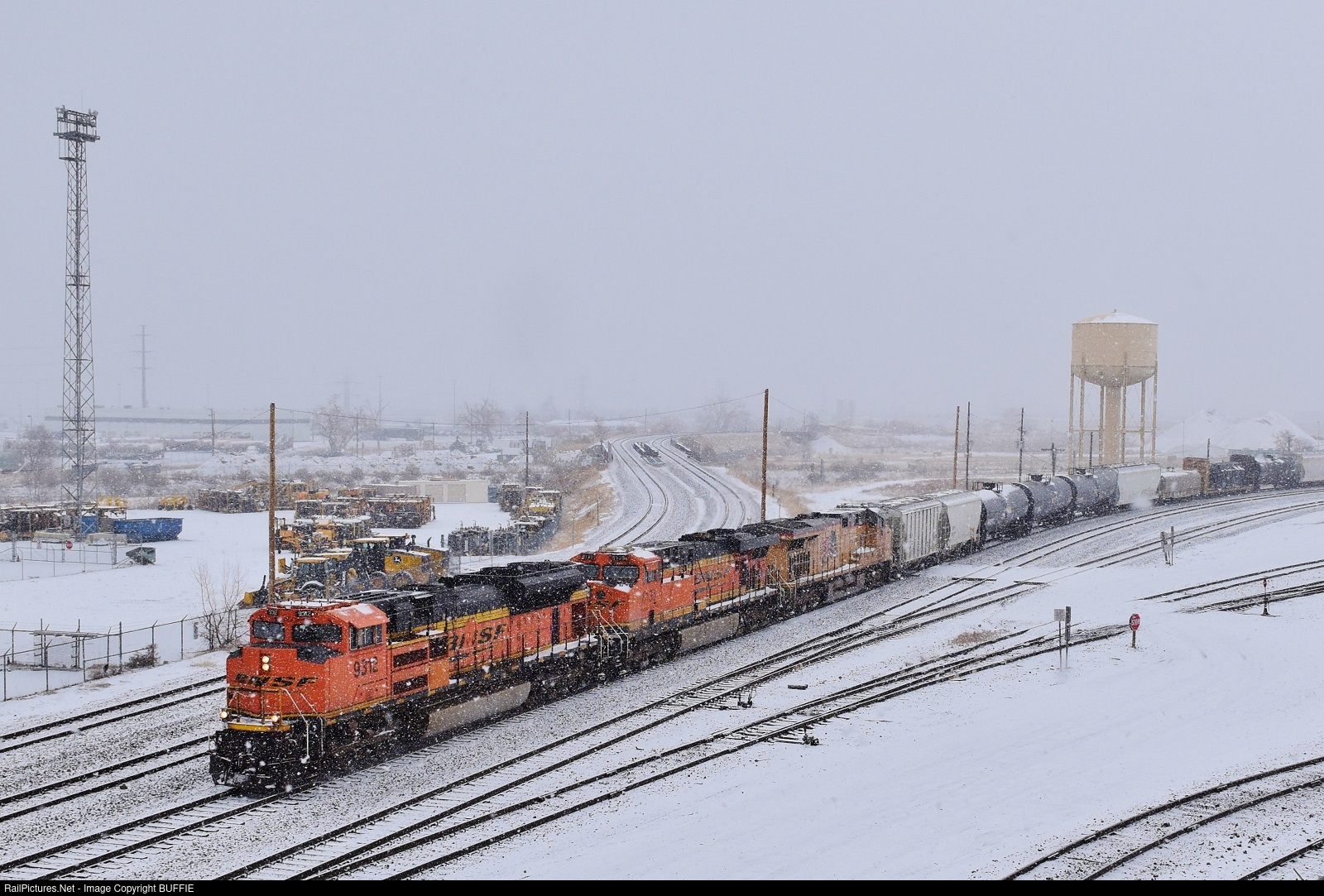 | Snow is falling fast as BNSF ACe 9312 takes a freight through the North Yard and onto the Joint Line which will lead to Grand Junction, Colorado on the Western Slope. |