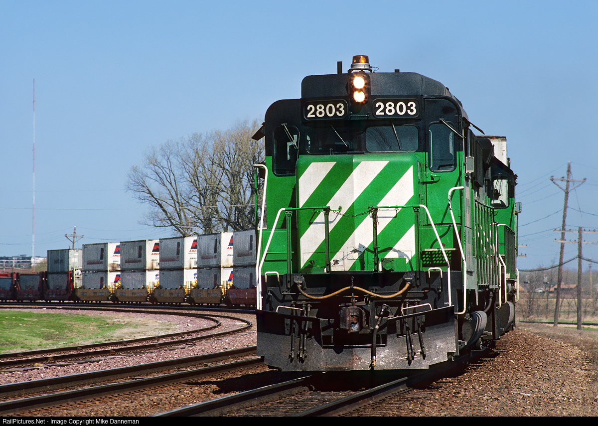 It sure looks like a GP30 Burlington Northern train 4 curves out of Rochelle, Illinois, on the morning of April 6, 1991. Still looking like a GP30 as EMD intended when built in February 1963, only it was built as Cotton Belt No. 5007, and rebuilt by Morrison-Knudsen into BN GP39M No. 2803. Regardless, it still sure looks good.
