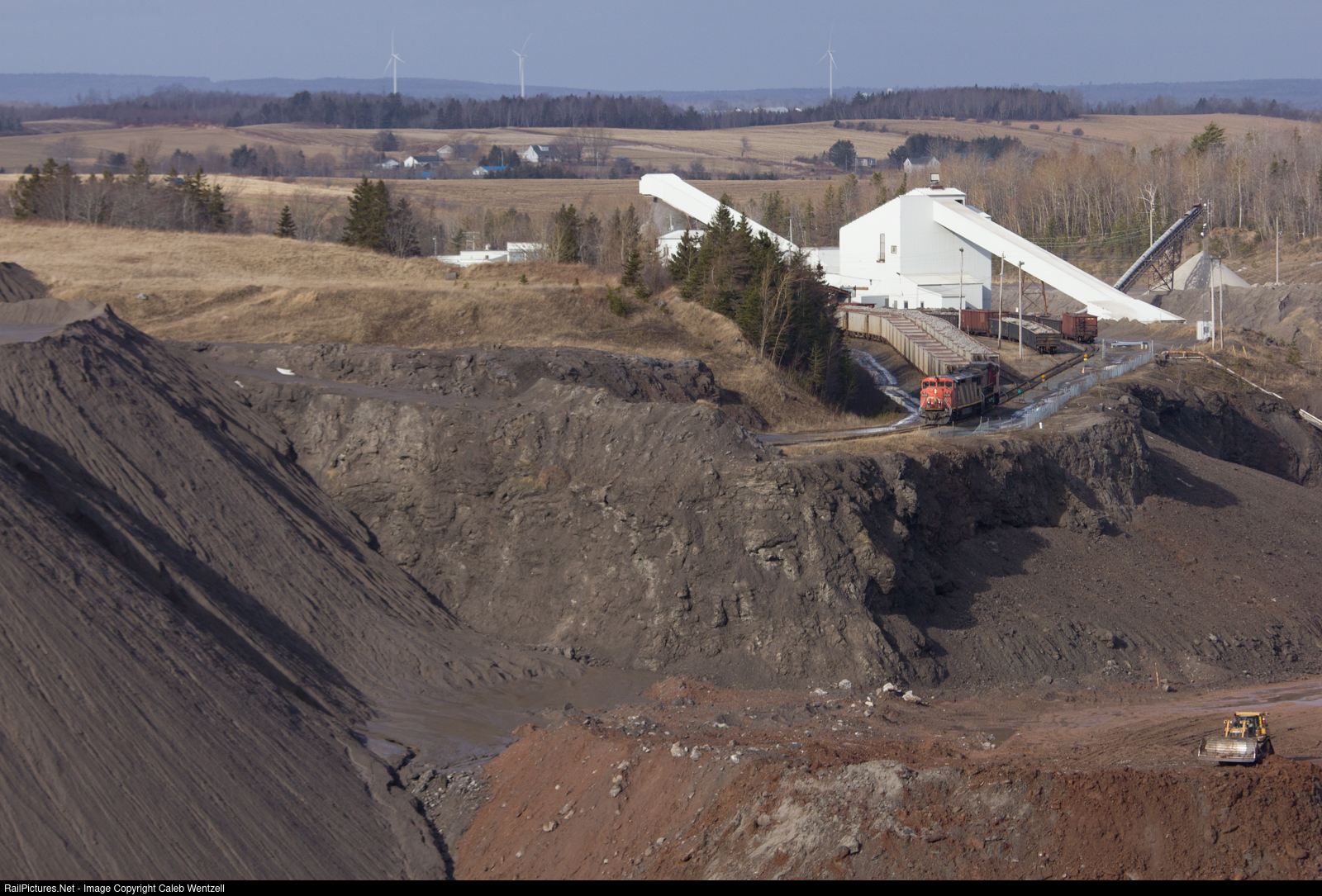 The crew of CN L51111 12 has just cut off from the empties and prepares to run around their loads to head back to Wright's Cove. This mine is the world's largest open pit gypsum mine and is serviced by CN five days/week.