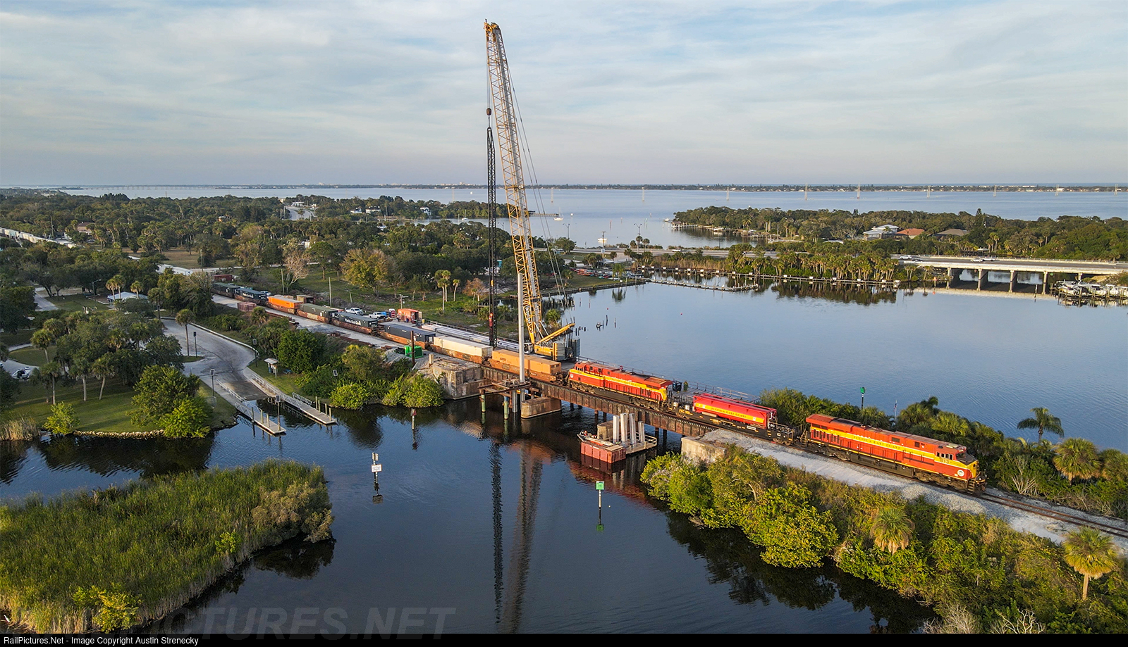 | Florida East Coast Railway train 105 crosses the Turkey Creek Bridge in Palm Bay, FL. The bridge here is being replaced as part of the Brightline passenger rail double tracking project. |
