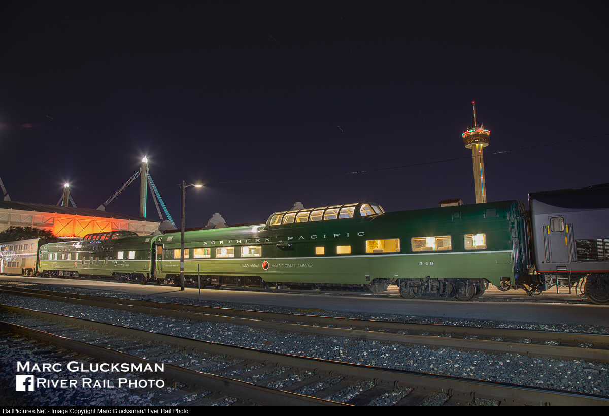 | Landmarks. Between the Tower Of The Americas and the Alamodome Webb Rail's former Northern Pacific Railway Budd built dome/coach 549 (WEBX 801045) and former Northern Pacific Railway Budd built Pullman dome/sleeper 313 (WEBX 801044) sit at the San Antonio, Texas Amtrak station on the night of January 2, 2021. This was a short visit, as the cars arrived on that day's "Texas Eagle" and departed the next morning.