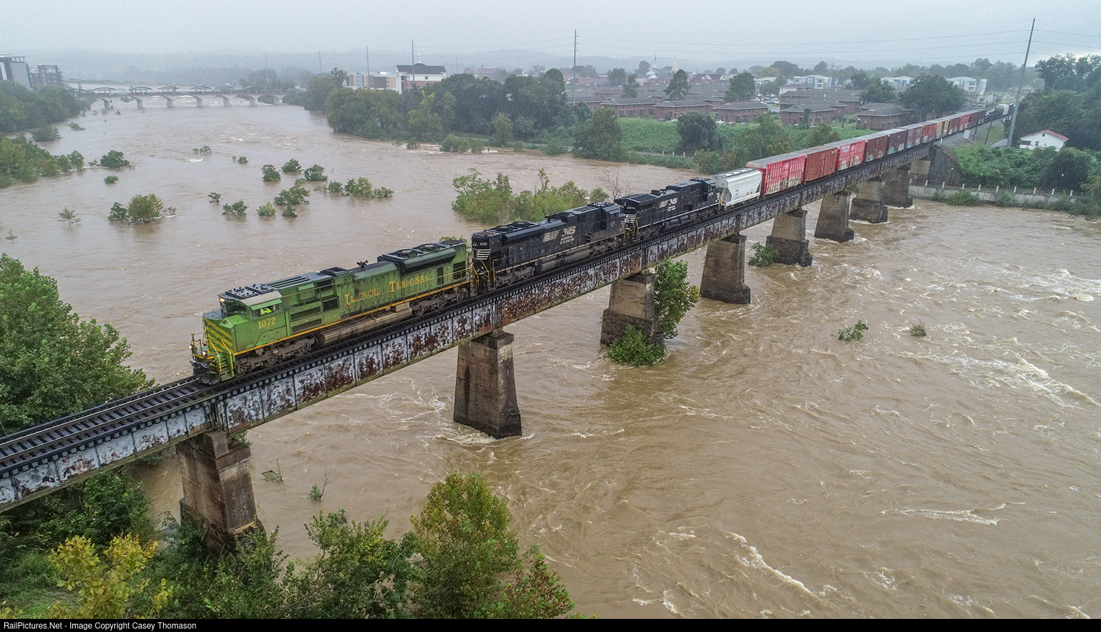 | A dirty Illinois Terminal heritage unit leads train 378 across a swollen Chattahoochee River into Columbus, GA, on a rainy early October afternoon. |