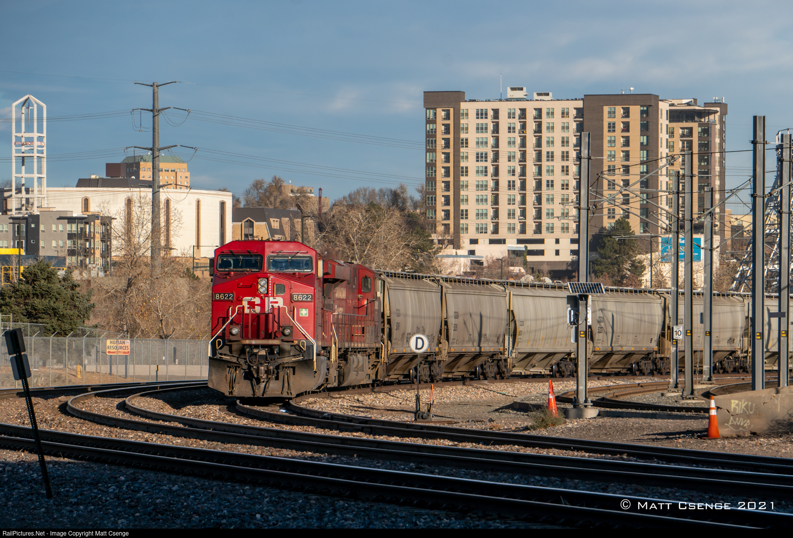 Canadian Pacific 8622 is on the end of a long unit train of covered hoppers sitting near Mile High Stadium in Denver.