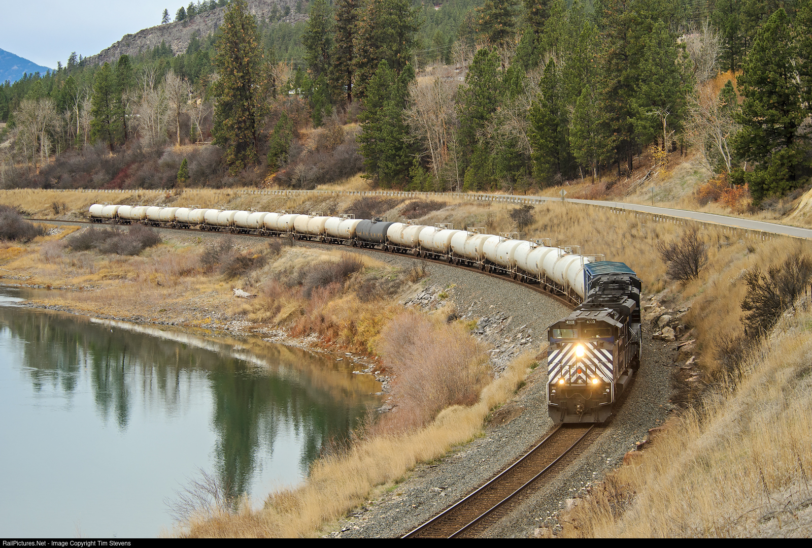 | Following the shores of the Clark Fork, MRL's day gas empties head east on the 4th Sub approaching Plains, MT. |