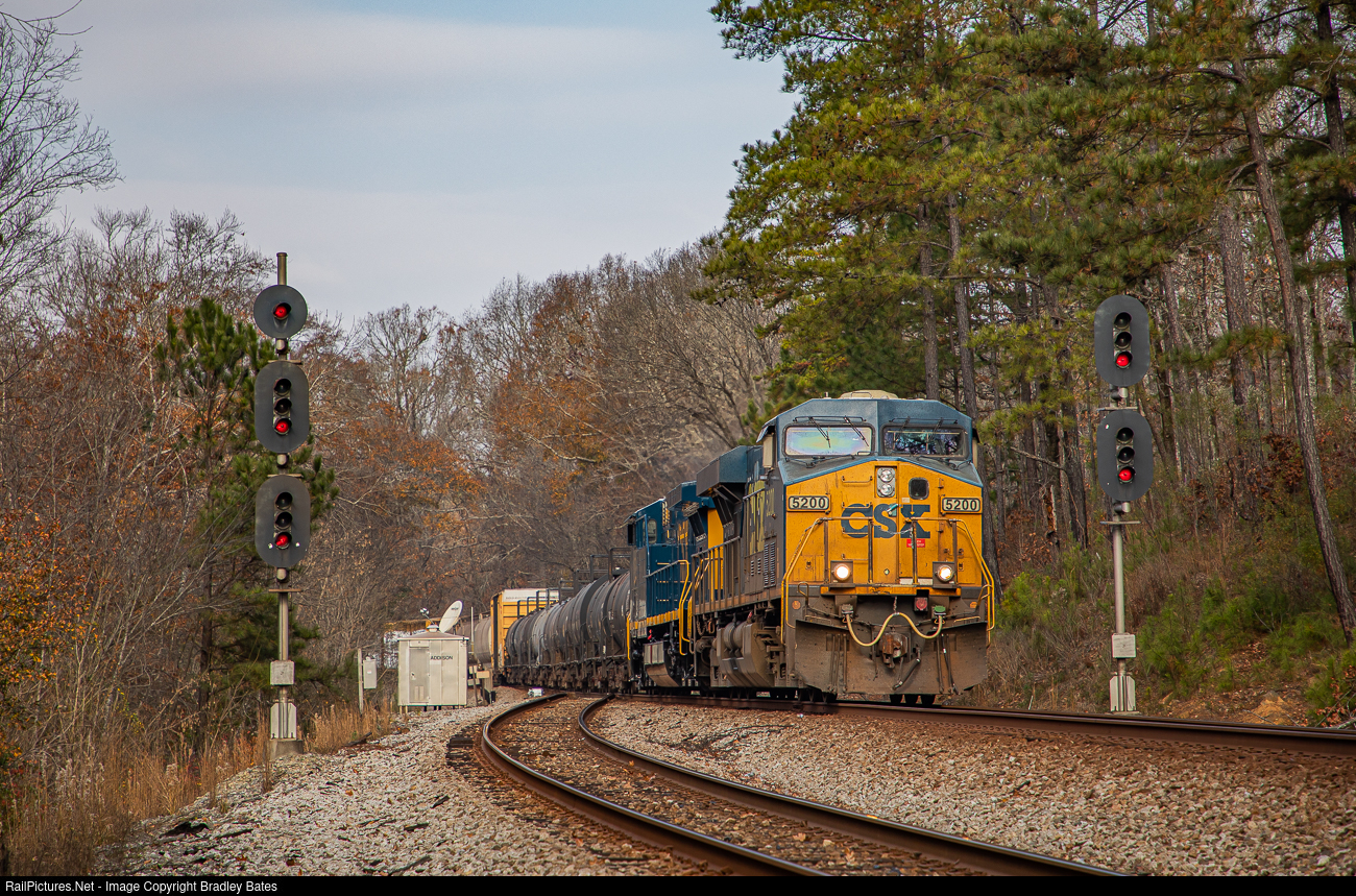 | CSXT ES40DC #5200 leads Train Q645-05 south passed the last set of Coast Line Signals on the Lineville Sub at control point NE Addison in Harpersville, AL., on an early Sunday morning. |