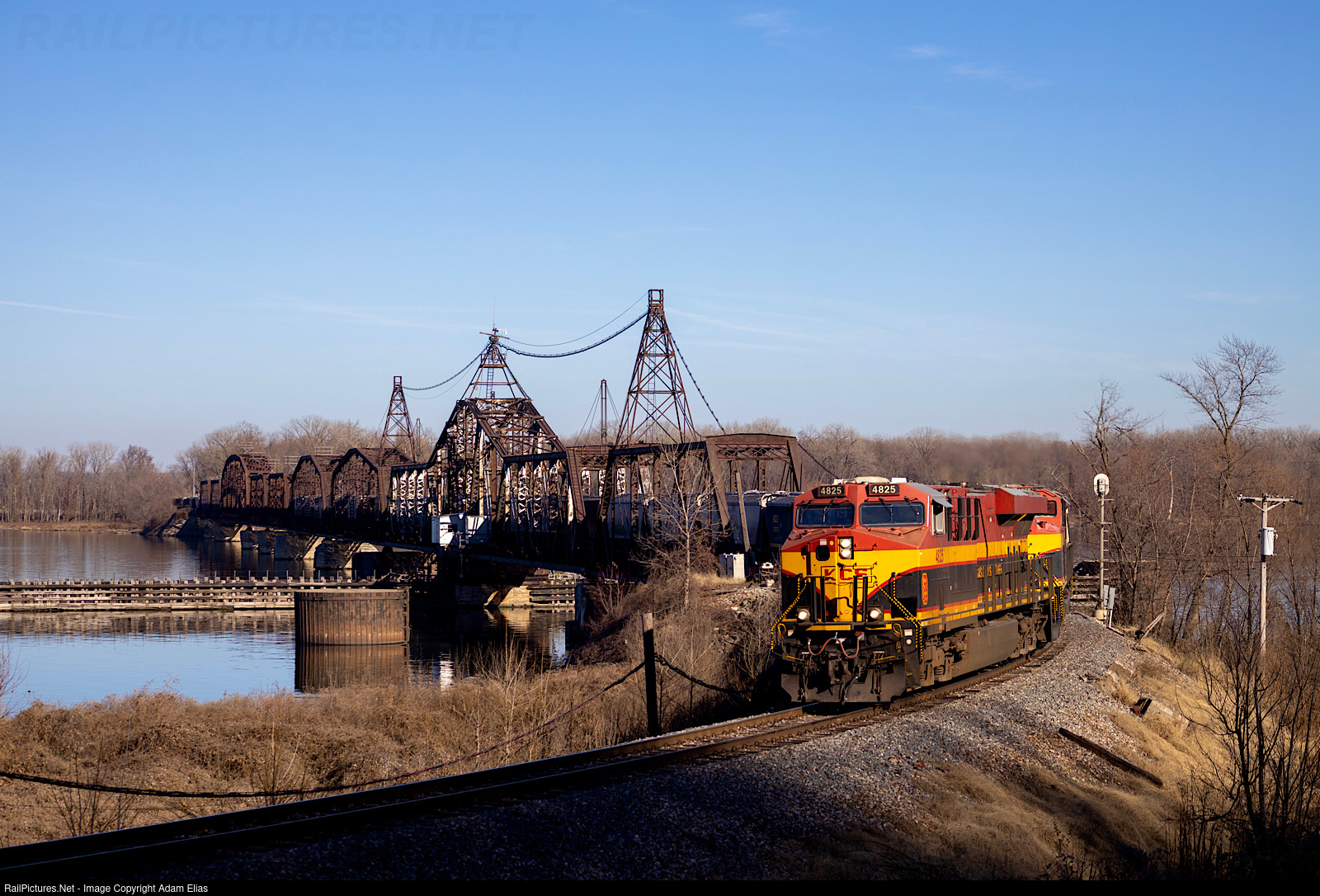 | KCS 4625 & KCS 4068 lead GJVSJI from the Jacksonville, Illinois grain loop across the Mississippi River as they begin their trek across the state of Missouri towards Kansas City. |