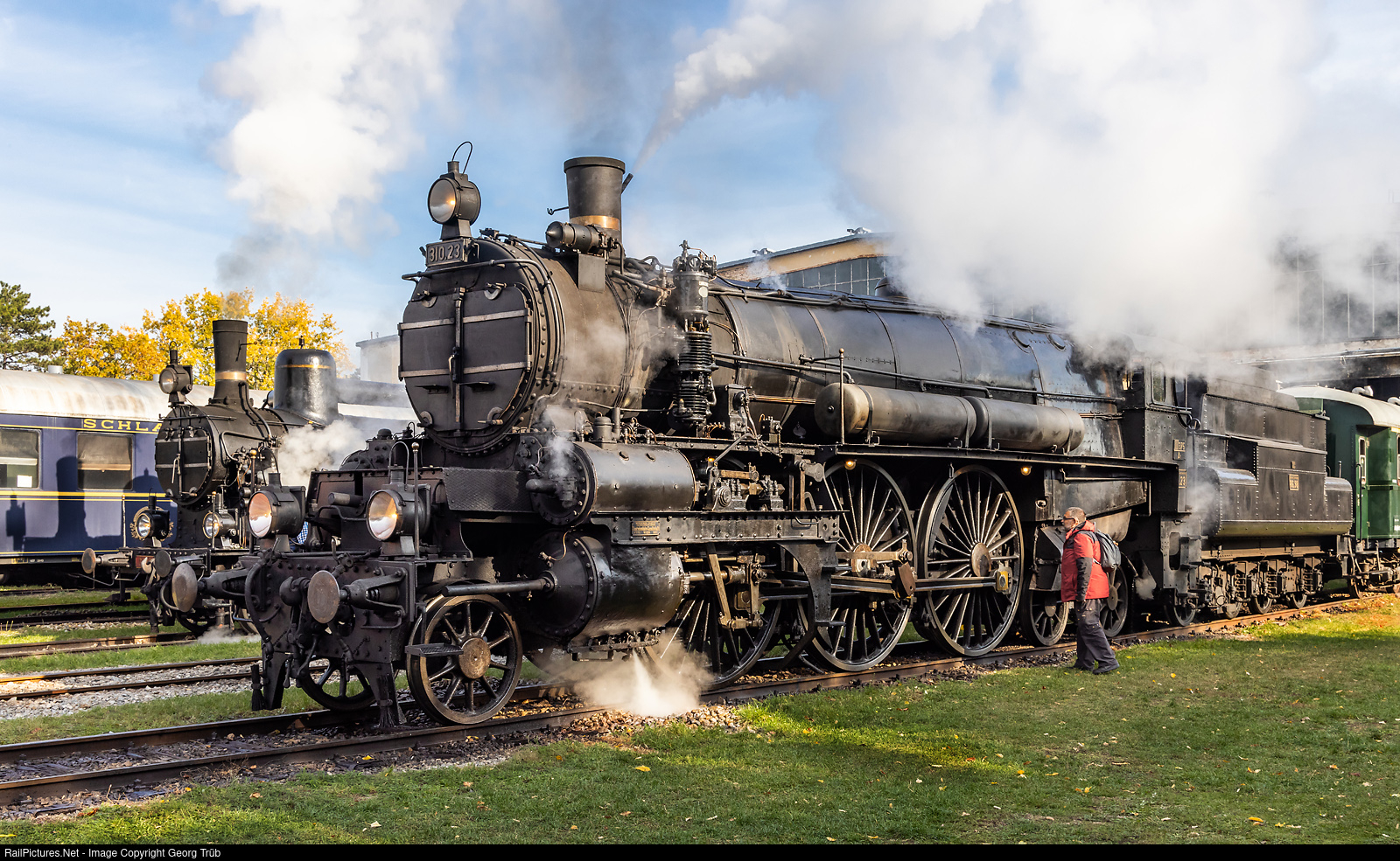 Nice comparison of the impressive 2,14 meter (78,74 inches) diameter driving wheels of steamlocomotive 310 # 23 with a visitor from Switzerland in the Heizhaus Strasshof railway museum. The 2-6-4 fourcylinder compound express train steamlocomotive 310 # 23 was built in 1911. Between 1911 and 1916, the kkStB (kaiserlich-königliche Staatsbahnen) procured a total of 90 locomotives for express service on the Northern Railway, the Franz-Josefs Railway and the Western Railway. Despite the imposing driving wheel diameter of 2,140 meters (78,74 inches), the locomotives were approved for 100 km/h only (62,13 mph). The design had to take into account that both the axle loads and the overall length were limited within narrow limits by track and turntable conditions. Karl Gölsdorf had already addressed this with the 210 series and now modified it so that it was powered by a superheated steam four-cylinder compound engine. Because of the sluggish controls, however, the locomotives designated as the Series 310 remained flatland engines, but there they produced up to 1800 hp. The locomotives were supplied by the Floridsdorf locomotive factory, the Wiener Neustädter Lokomotivfabrik, the Bohemian-Moravian machine factory, the StEG locomotive factory and the Bohemian company Breitfeld & Dan?k. The locomotive 16.08, which was taken out of service in 1956, was initially set up as a museum locomotive in front of the Vienna Technical Museum, but was then restored and made operational again in 1985-1987 for the 150th anniversary of the Austrian (mechanically powered) railroads. It is used for nostalgia trips under the old number of kkStB 310.23 and is stationed at the Strasshof Railway Museum.