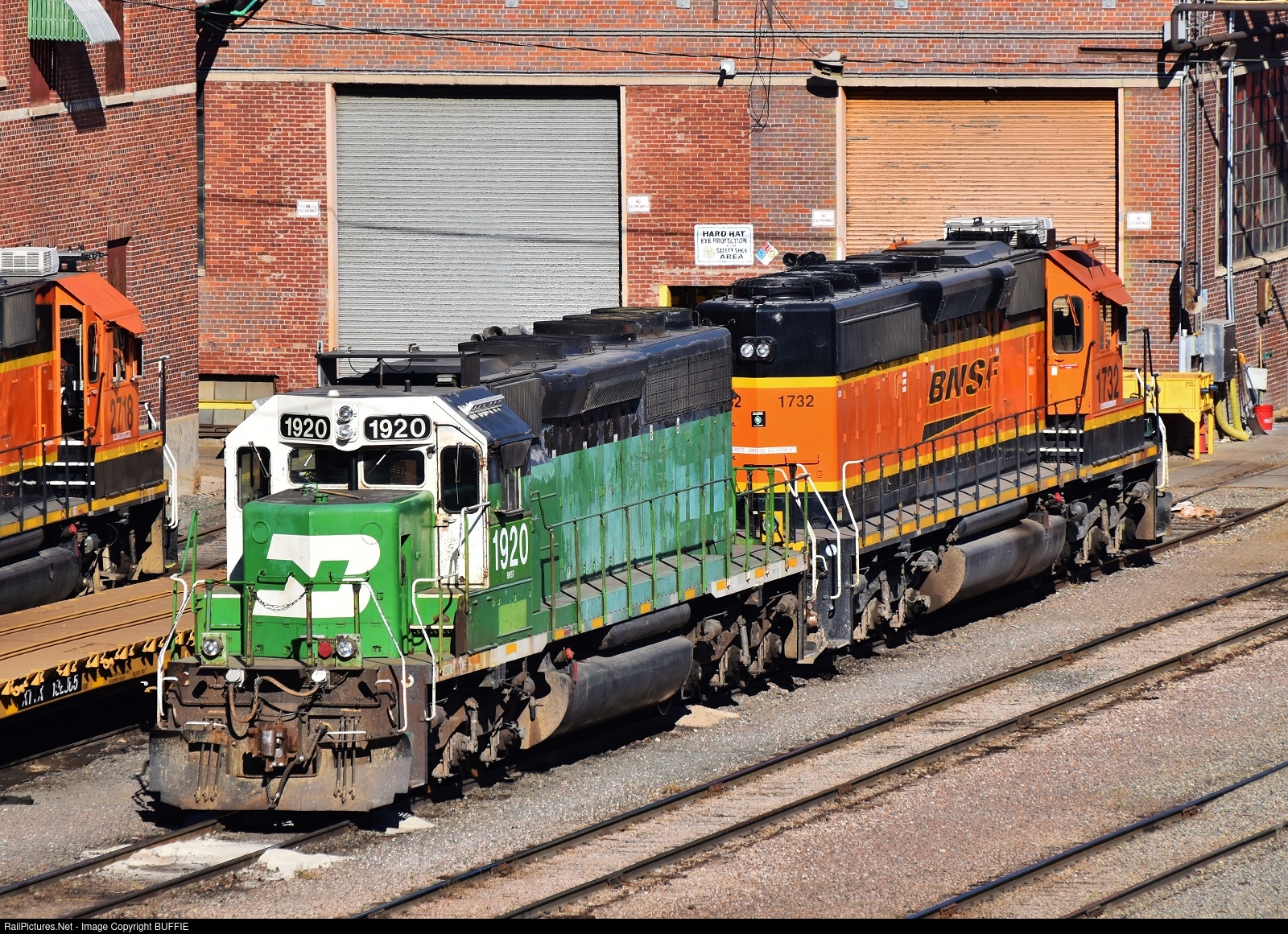 | BNSF 1920 (SD40-2), still in its Burlington Northern Cascade Green paint, sits at the engine servicing facility in Denver, Colorado. |