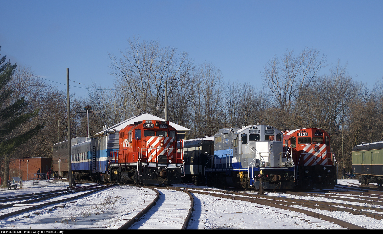 | Exporail's Christmas Train boards passengers at Hays Station. Power is GP9 CP 1608, at right is GP9 AMT 1311 which was supposed to be the power for it. Unfortunately its batteries were dead and it was not able to lead. |