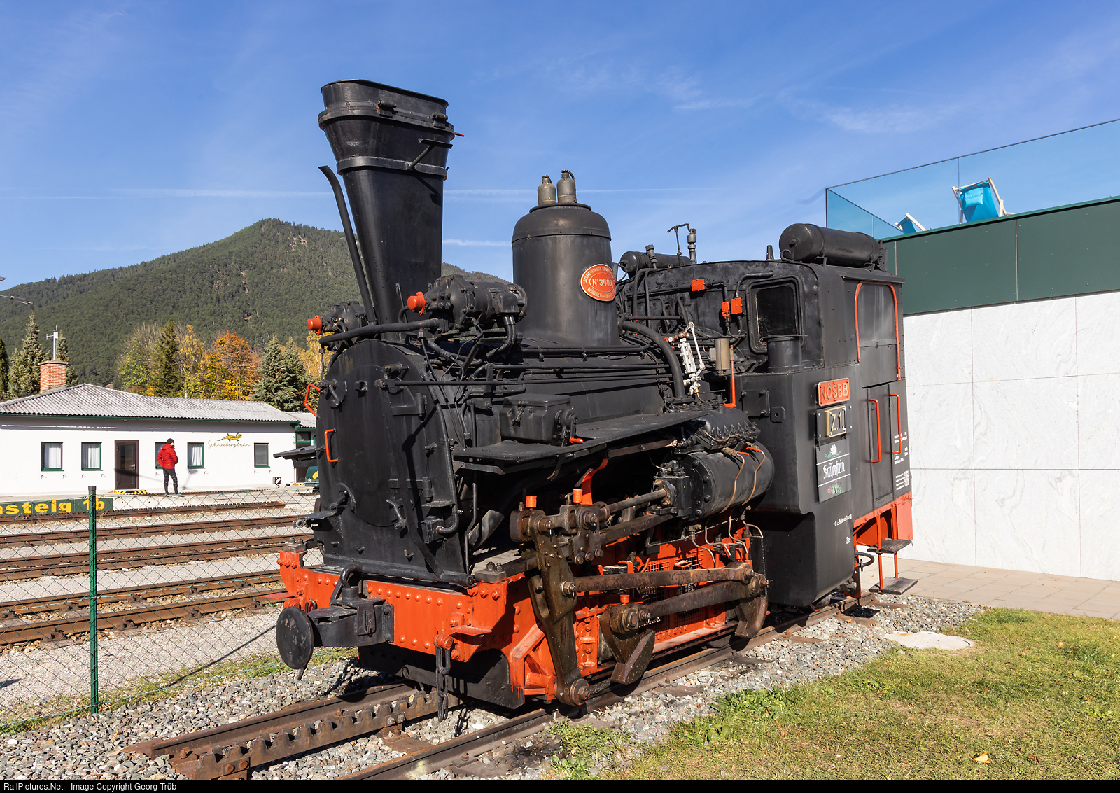 1 meter gauge Abt cogwheel system 0-4-2 T steamlocomotive Z # 1 "Kaiserstein" of the Schneebergbahn, exhibited in Puchberg am Schneeberg since july 2020. Built in 1896 by Krauss/Linz as Z # 1 for the Schneebergbahn/EWA (Eisenbahn Wien-Aspang) and designated 999.01 by the ÖBB since 1937. Since 1996, the Niederösterreichische Schneebergbahn GmBH (NÖSBB) is operating the line and sister steamlocomotives Z # 3 and Z # 5 are operational, running on sundays in july and august up to the mountain. The locomotive is fitted with a Giesl ejector, invented in 1951 by the Austrian engineer, Dr. Adolph Giesl-Gieslingen.