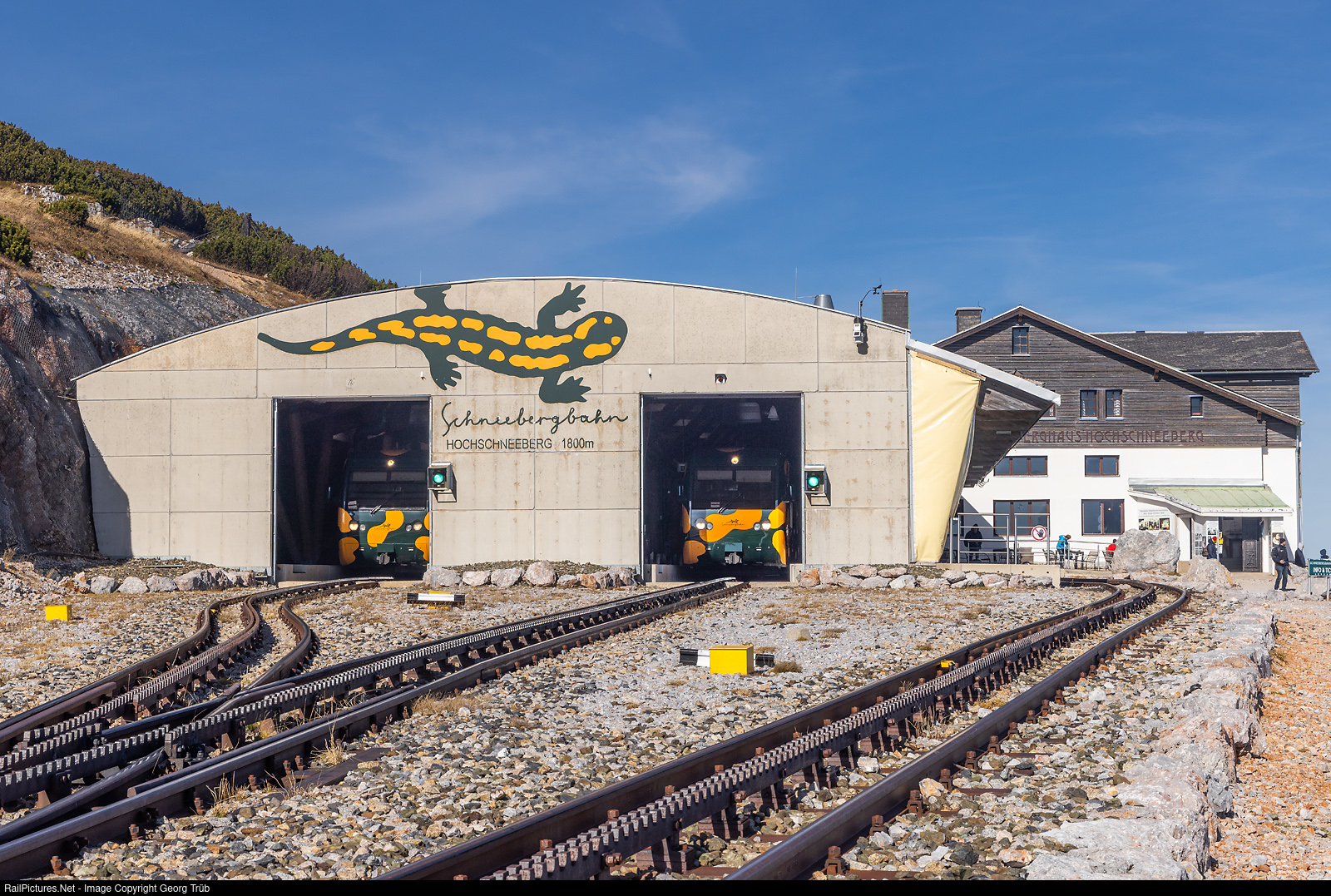 | Hochschneeberg station on 1796 meter a.s.l. of the Schneeberg cogwheel railway. This modern station building dates from 2009. On the two tracks are standing "Salamander" trains # 11 and # 13, ready to run down to Puchberg am Schneeberg. The 9,8 kilometer long line with the Abt cogwheel system has a gauge of 1000 mm (1 meter). |