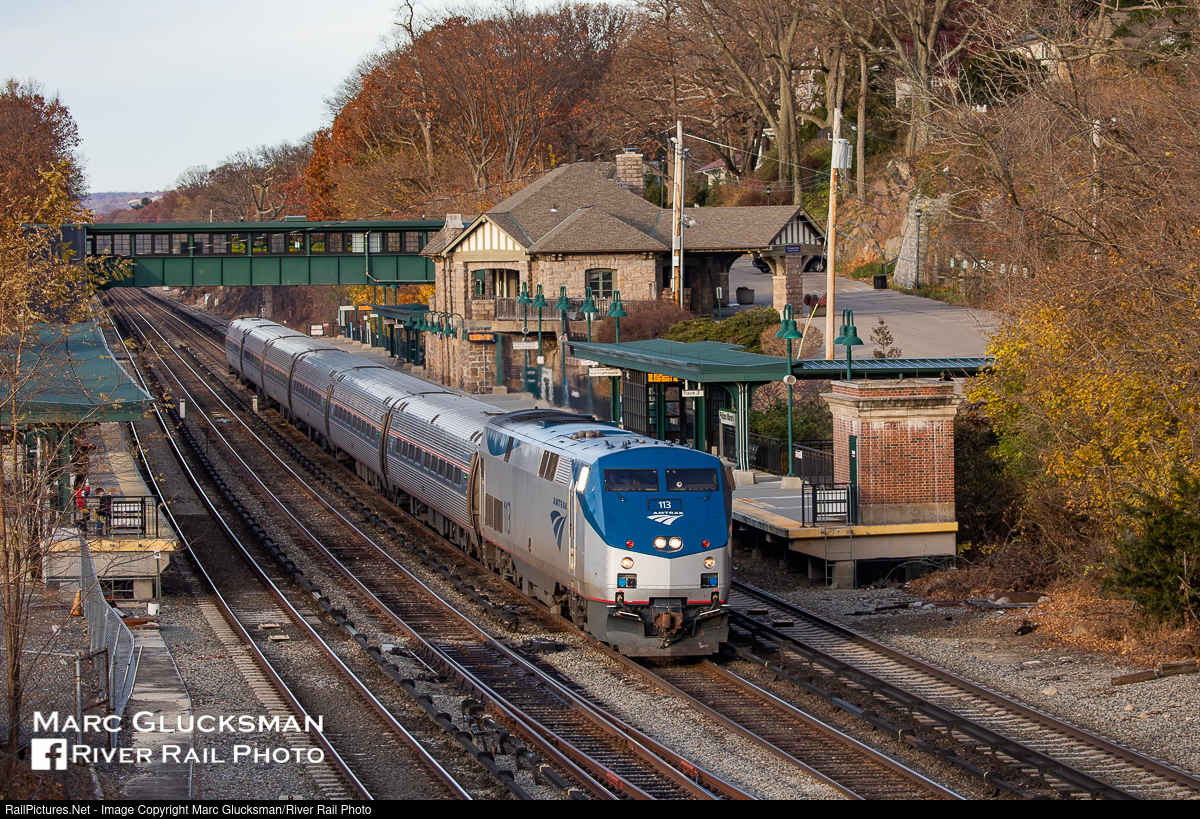 It Happens. From time to time when a dual mode (third rail electric or diesel powered) P32 is not available, Amtrak will use P42s in Empire Service. Some of Penn Station’s platforms contain ventilation systems for this contingency. On December 5, 2021, Amtrak Train 284 was lead by AMTK 113 from Niagara Falls, New York all the to New York Penn/Moynihan Station. The train is seen operating southbound on Track 1 passing the elegant former New York Central station in Philipse Manor, New York.