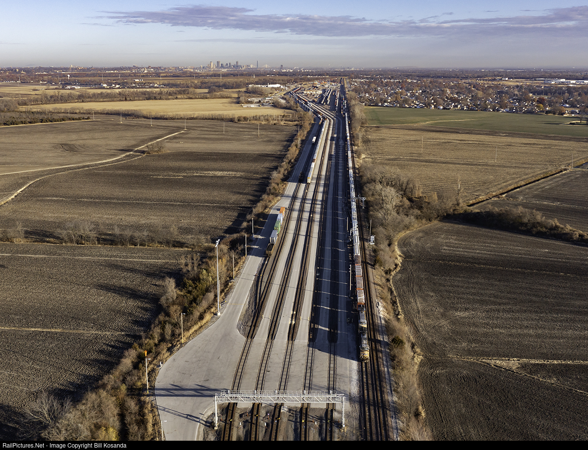| Union Pacific 5745 prepares to depart the Dupo, Illinois yard on Main Track 1. In the background you can see the St. Louis skyline. |