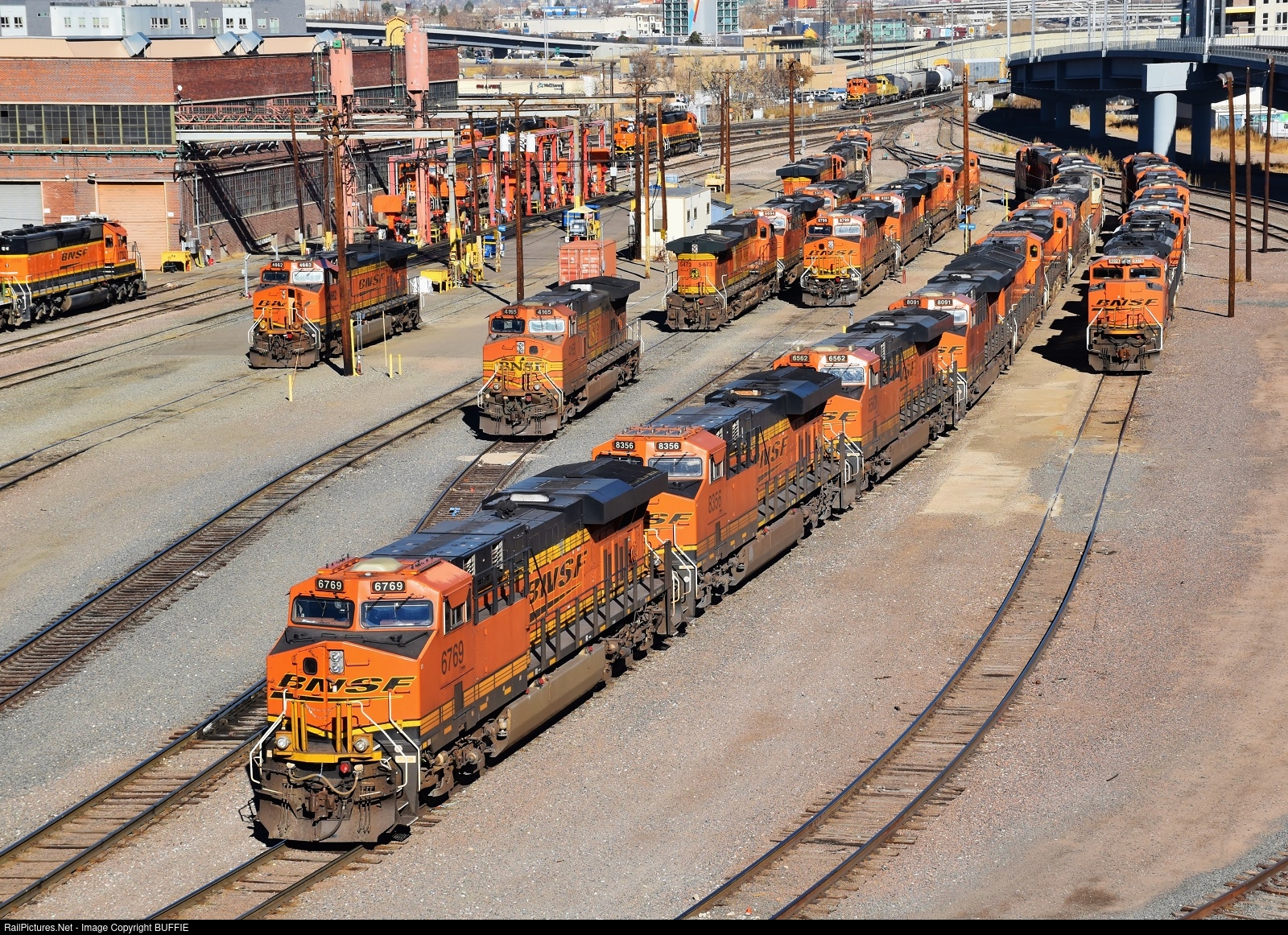 Heavy BNSF pumpkins load up the yard of the engine servicing facility in Denver, Colorado.