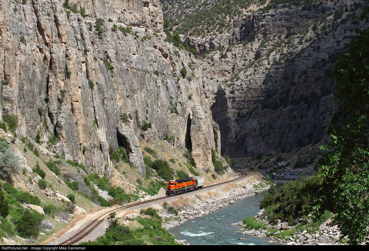 BNSF’s east local out of Greybull powered by a pair of EMD SD40-2s, rolls quietly southward with a single car for Bonneville, and is dwarfed by the steep rock walls of Wyoming’s scenic Wind River Canyon between the sidings of Minnesela and Dornick on BNSF’s Casper Subdivision on June 28, 2021.