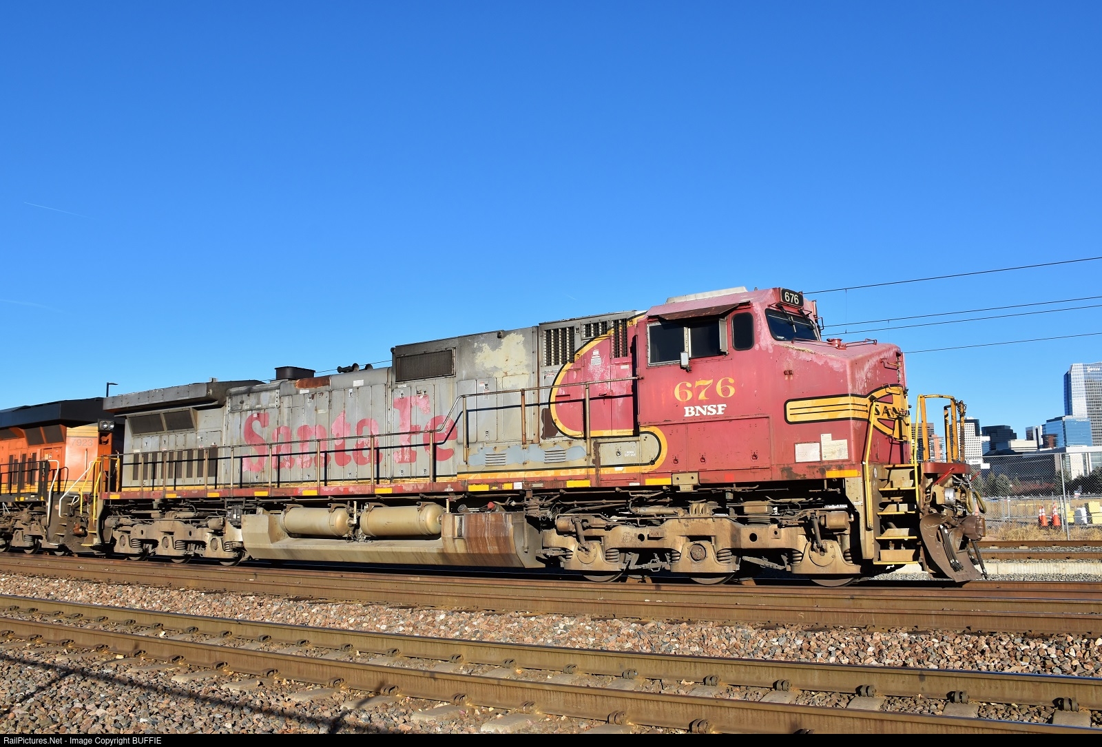 Even though the paint is faded and has a bad case of sunburn rash, BNSF 676 (Dash9) still looks good carrying the original Atchison, Topeka & Santa Fe Warbonnet scheme.