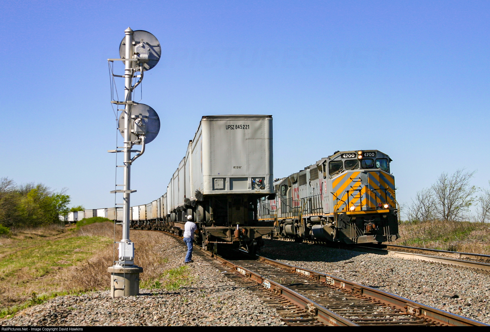 | Pig train DAMT (Dallas-Metro Jct.) handing off the intermodal cars to the NB BNSF Z train about to hitch up the pigs and go north to Chicago. The BNSF conductor in the photo will get a free ride on the KCS engines to the head end of the NB Z train. Sure beats walking. |