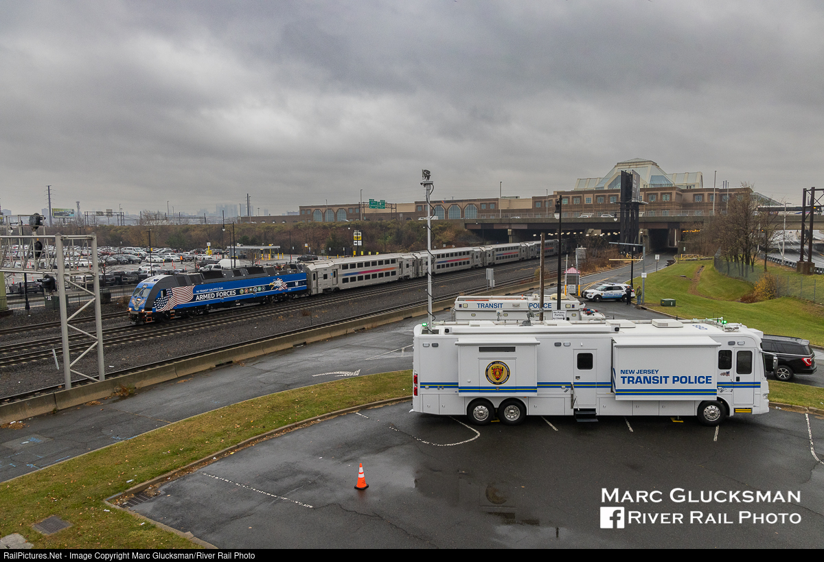 NJ Transit Salutes Our Armed Forces. On Saturday, December 11, 2021, Train 1931 (Meadowland Shuttle), ALP-45DP 4502 made its first appearance in its new wrap in service to the Army Navy Game of 2021 at Met Life Stadium. The full body wrap includes logos from all six branches of the armed forces. It is seen leaving the Secaucus Junction station in Secaucus, New Jersey at just before noon, already making its second trip of the day. NJ TRANSIT also added 7 more "banners" (6 branches and 1 collective) to other ALP45-DPs for the occasion. A few New Jersey Transit Police Command vehicles sit in the foreground, and the New York City skyline is just beginning to peep through the fog.