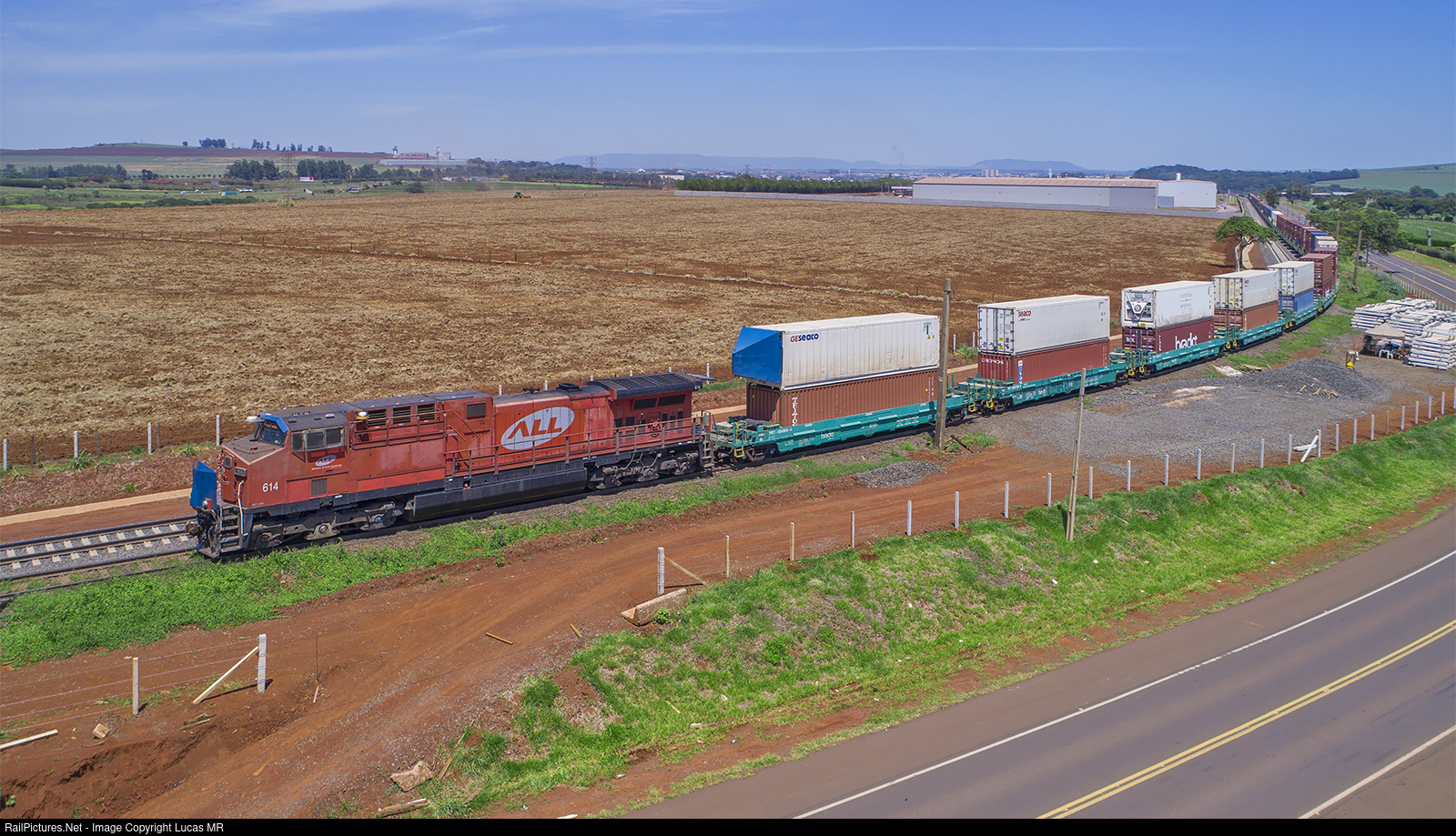 | Doublestack train D71 departing Cordeirópolis, led by AC44i #614. This train uses some acessories on the front end of container and locomotive to make them more "aerodynamic" and reduce the drag. |