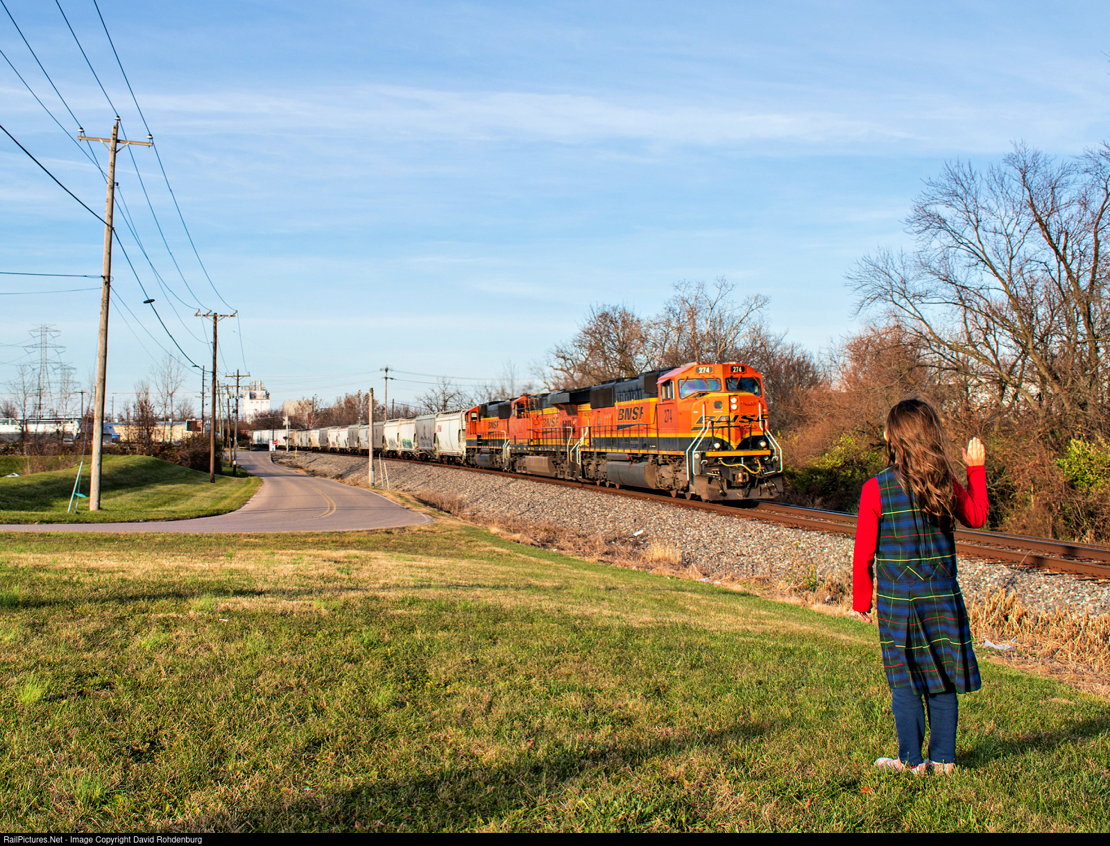 Our middle daughter gives a wave to the crew of NS train 25A with a solid set of BNSF power, led by SD75M No. 274.