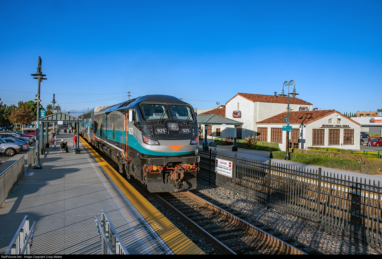 It was a busy afternoon at Metrolink’s station in Orange due to a fatal trespasser strike in Santa Ana, which closed the line for over three hours. At 3:39 pm (15:39), Metrolink train 663 (Oceanside to Los Angeles), now running 3 hours behind schedule, is the first of six trains that will pass through the station in the next 40 minutes, all on Metrolink’s Orange Sub’s Track 2 (normally used only for southbound trains). This is a busy line on weekdays, but on this Saturday afternoon it was possible to see two trains at one time twice – once as this train was departing and Amtrak Pacific Surfliner 774, which had been holding in Anaheim for 2 hours and 48 minutes, appeared to the north while it waited for Metrolink 663 to cross over to Track 1. And then there were three more Metrolink trains (one southbound and two northbound, one heading to Los Angeles and the other to San Bernardino) with a northbound Surfliner mixed in. Metrolink did a lousy job of lettering passengers know which platform to be on for their trains. The conductor on this one, train 663, anticipated the confusion, and held his train until everyone waiting on the wrong platform was aboard. But a later train, 665, had a conductor who was closing the doors as passengers were still boarding because, as he told one of them, “We’re already late.” That’s no excuse for stranding passengers who have been waiting longer than normal! (Orange, California – December 11, 2021)