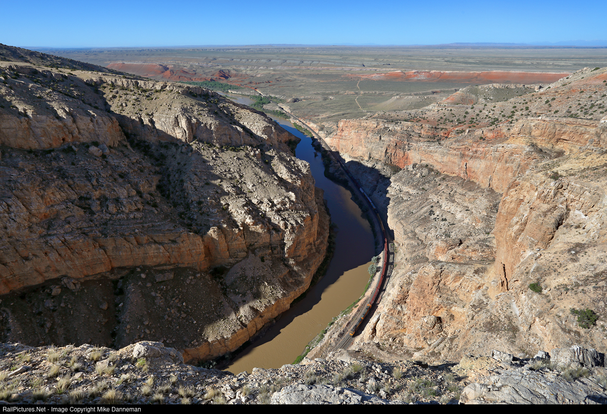 Over many millennia, the Bighorn River cut a deep path through the spine of Sheep Mountain, also allowing Chicago, Burlington & Quincy to build a parallel path through the chasm in 1905-07. Today’s BNSF still uses this route to link the railroad between Casper, Wyoming, and Laurel, Montana, on the Casper Subdivision. On the morning of June 23, 2020, BNSF’s Cowley turn heads northbound along the Bighorn through the depth of Sheep Canyon as seen from high above on the canyon’s rim.