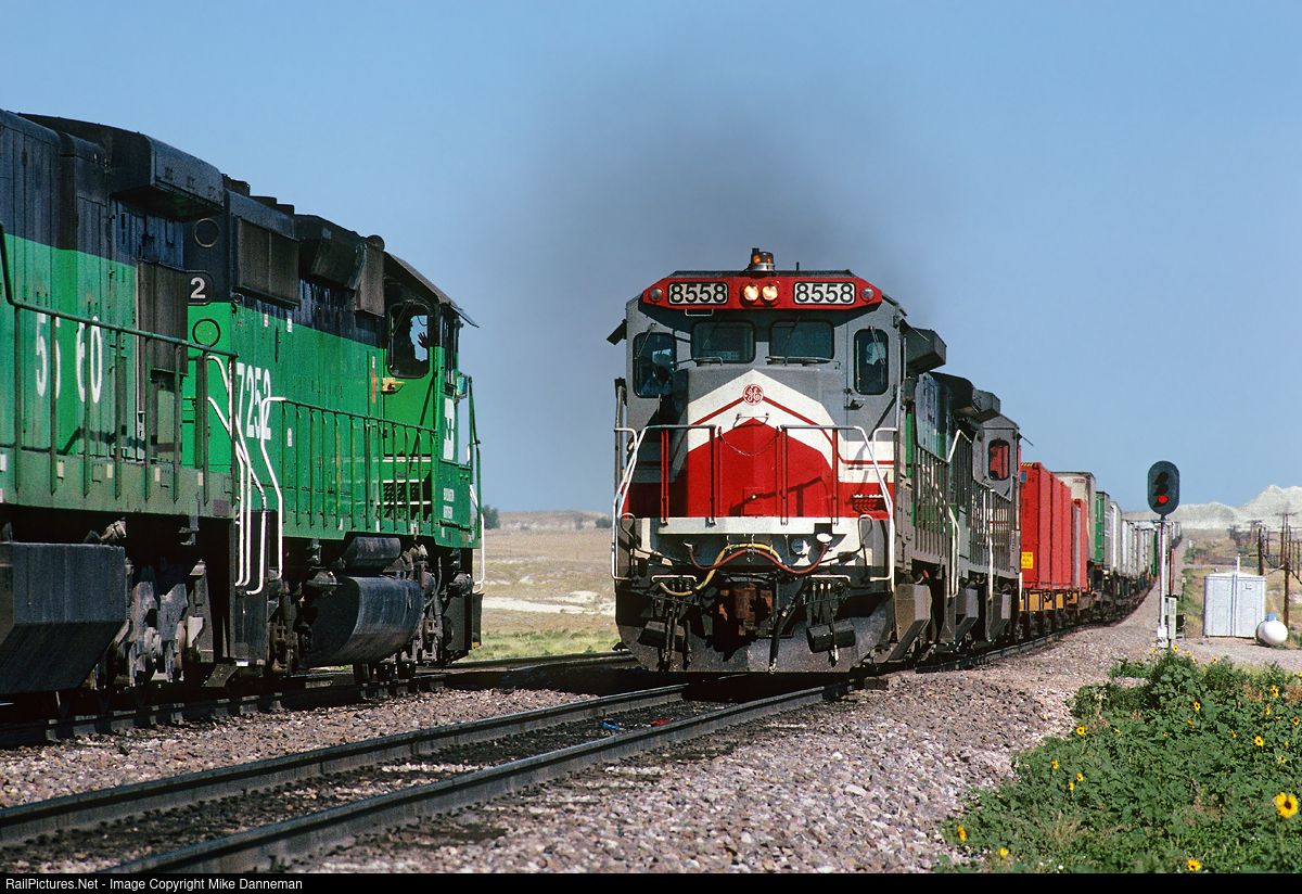 An eastbound Burlington Northern intermodal train meets a westbound coal empty at the end of double track at Joder, Nebraska, on July 3, 1989. Leading the intermodal is LMX GE B39-8 No. 8558. BN operated a fleet of 100 of these locomotives from LMX, paying for kilowatt/hours generated in freight service to the lessor.