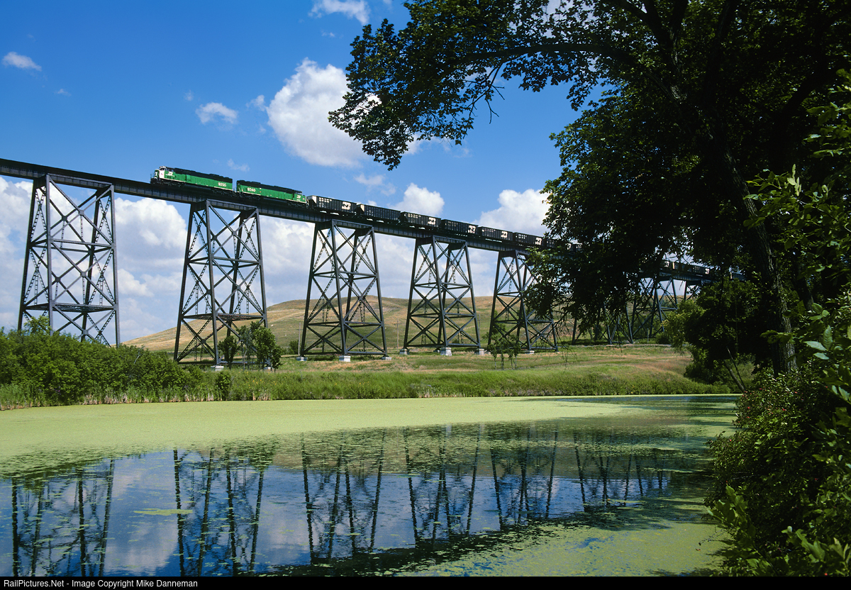 In Valley City, North Dakota, a westbound BN coal train powered by a pair of EMD SD60Ms, crosses the massive High Bridge over the Sheyenne River on August 11, 1991. Built by the Northern Pacific between 1906 and 1908, the 3,860-foot-long bridge soars 162 feet above the river.