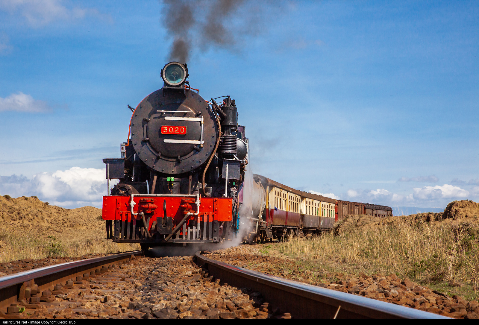 | 2-8-4 "Tribal"-class 30 # 3020 "Nyaturu" (built by North British in 1955 for the East African Railways EAR) of Nairobi Railway Museum (NRM) is pulling a mixed charter train for Geoff's Trains/Tanago near Munyu towards Nairobi. 26 of this class were built in 1955 by North British Locomotive Company for the East African Railways (EAR) and served their entire careers in Tanganyika/Tanzania, one of the three territories/countries served by the EAR. |