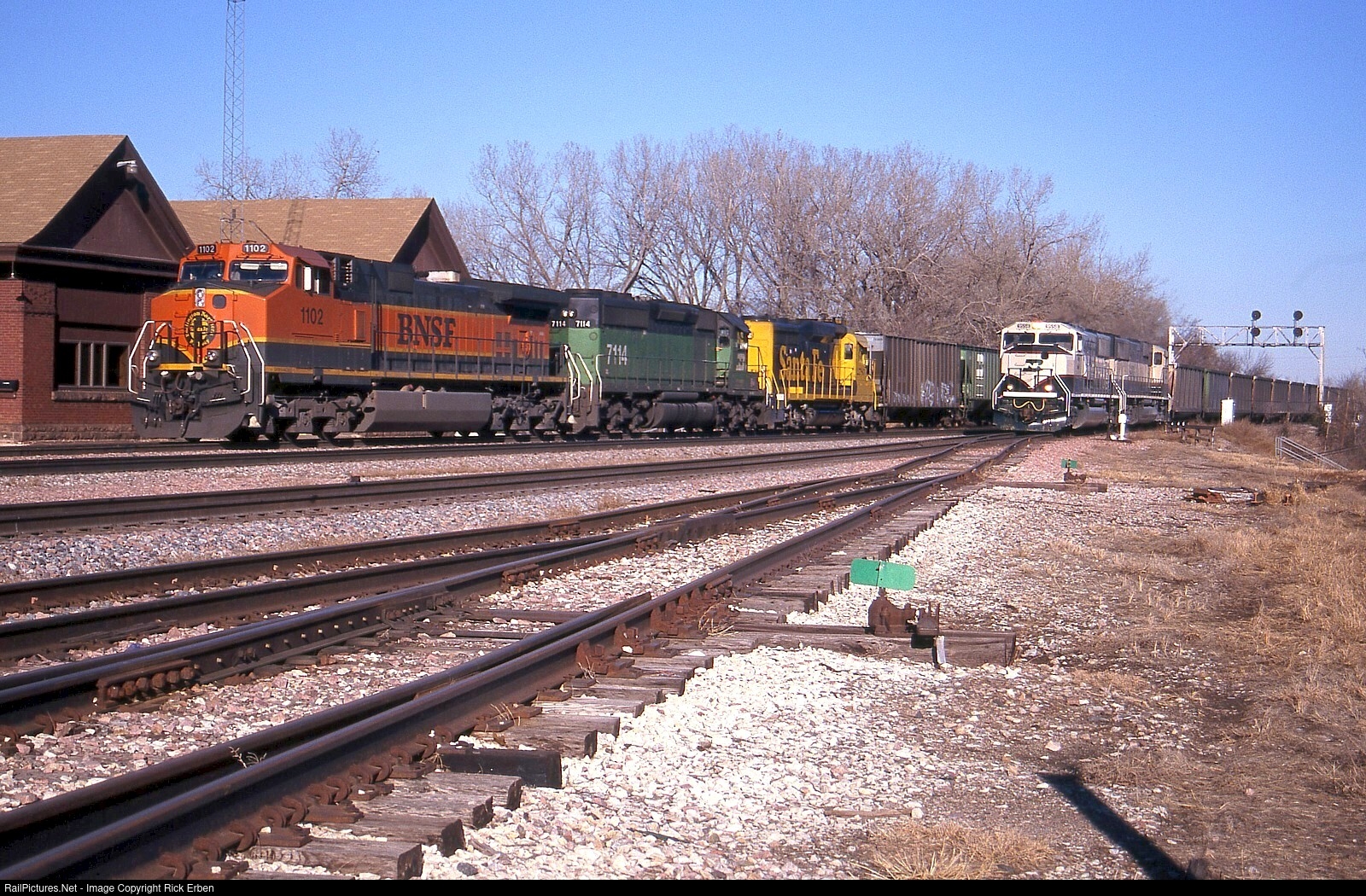 A train off the Sioux City Sub waits at the Ashland depot, that was still an open office with operator at the time. On the Creston Sub a pair of classy SD70MACs lead westbound coal empties toward Lincoln and beyond. Today the depot is razed, the Q-style signals are gone, the coal traffic has waned and the power is less varied (to put it nicely). Down beyond the signal bridge the Sioux line heads north through a wye, the east leg of which allows traffic from Kansas City to access the route.
