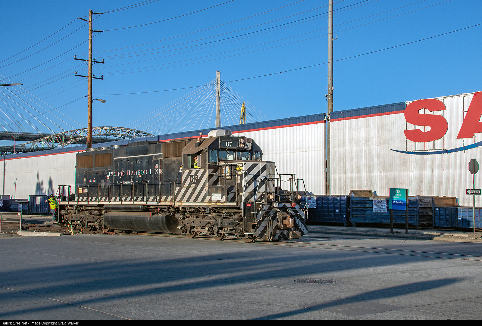 It is only 3:54 pm (15:54), but the sun is already low in the sky, and will set in another hour. Still, it is all good, as Pacific Harbor Line local YPSW14-27 rarely switches the Weyerhaeuser Lumber (Fremont Forest) facility while the sun is up, even in the summer, when the sun sets much later, so this is a treat. PHL MP20C-3 67 is bringing in two loaded centerbeam bulkhead flats, to add to the three cars already being unloaded within the facility at the end of the Pier T Lead, and has cut off from the cars and will run around them in order to shove them into the Weyerhaeuser property. Once the lumber has been delivered, PHL 67 will haul five ROGX hopper cars north. PHL 67 was built by MotivePower Inc. in December 2007, utilizing the frame from Southern Pacific SD40R 7361 (ex-SP SD40 8478) – notice the plate on the nose, where the SP lights used to be. As with all of PHL’s fleet, MP20C-3 locomotives have a cleaner exhaust them most diesels. Looming in the distance are the old, decommissioned Gerald Desmond Bridge and, behind it, the recently opened Long Beach International Gateway cable-stayed bridge with a clearance of 205 ft (62 m) above the waterline, which allows larger container ships to pass underneath then the older Gerald Desmond Bridge did. (Long Beach, California – November 27, 2021)