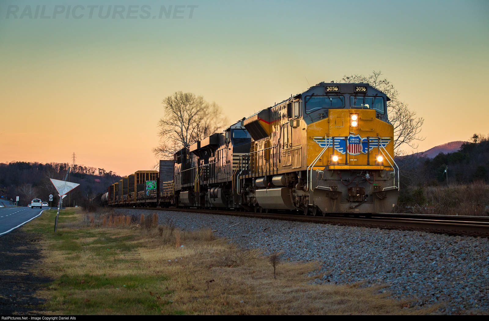 | The theme of foreign power continues here on the NS Christiansburg district today. A UP Tier 4 ACe leads NS 393 west by US 460 in Elliston, Va at sunset. |