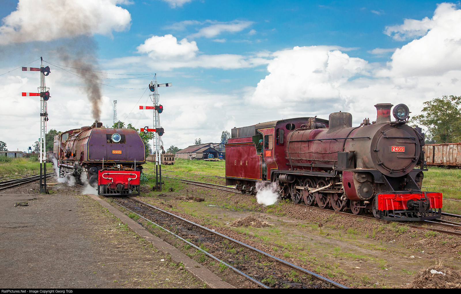 Sun came out in the right moment to enlighten the very rare meeting of this two classic locomotives of the former East African Railways, both under steam and operational. On the left the giant 4-8-2+2-8-4 Garratt # 5918 "Mount Gelai" from 1955, most powerful narrow gauge steamlocomotive ever built. On the right the classic East African Class 24 (former EB3 of Kenya Uganda Railways) # 2409, a 4-8-0 built in 1923 by Vulcan and Nasmyth Wilson/UK. Both locomotives are burning heavy fuel oil and belong to Nairobi Railway Museum today. They were steamed up for Geoff's Trains/Tanago, a very rare moment!