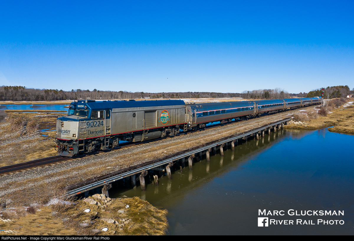 20 Years. Amtrak Downeaster service began on December 15, 2001, operating commuter passenger trains from Maine for the first time since 1965. Intitally service was provided between Portland, Maine and North Station in Boston, Massachusetts, and was later extended to Brunswick, Maine. On February 26, 2021, Amtrak Train 684 crosses Scarborough Marsh in Scarborough, Maine with AMTK 90224 (NPCU, née-AMTK 224, F40PH) leading with the distinctive Downeaster logo. At the 20th Anniversary event in Wells, Maine on December 15, 2021, a group of stakeholders including the State of Maine, Amtrak, Pan Am Railways, and The Federal Railroad Administration broke ground on a $22.9 million project to improve Downeaster service.
