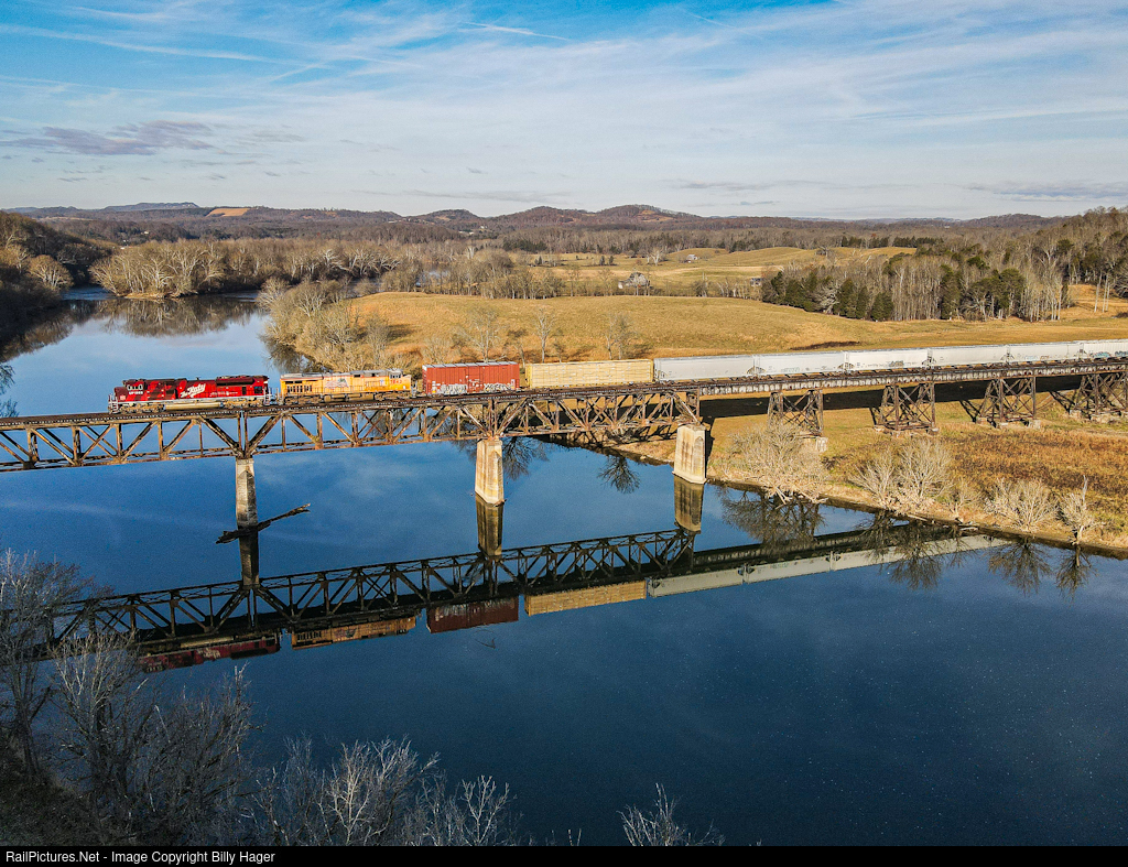 | The Frisco to Bulls Gap local T52 crosses the Holston River at Honeycutt Trestle near Surgoinsville, TN, with Union Pacific’s Katy Heritage Unit leading. This train will become 101 at Bulls Gap for the trip to Knoxville and farther West. |