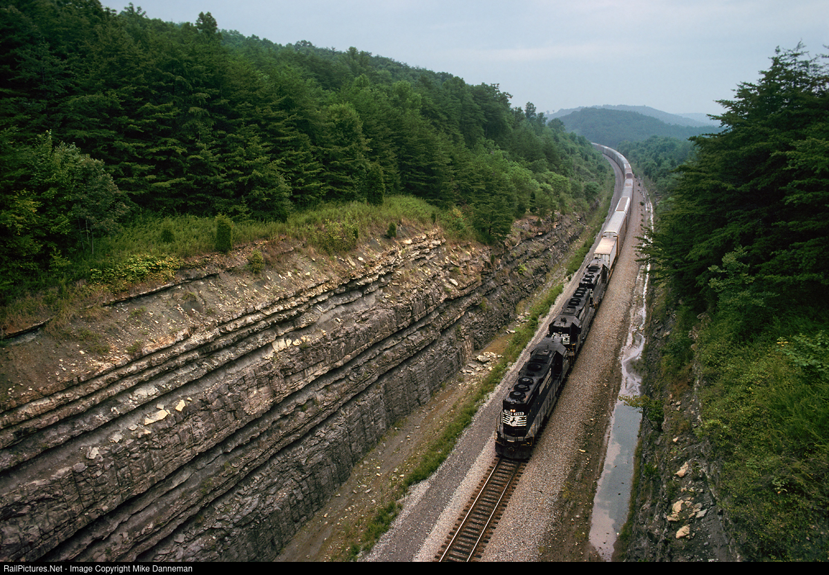 Norfolk Southern train 180, led by a trio of high-nose EMDs, is at Tateville, Kentucky, on August 23, 1992. The train is northbound, passing through a deep cut of the Southern Railway’s upgraded “Rathole” line between Cincinnati and Chattanooga. NS EMD GP50 No. 7060 leads the train, running long-hood forward as the CNO&TP (Cincinnati, New Orleans and Texas Pacific Railway) and Southern intended.