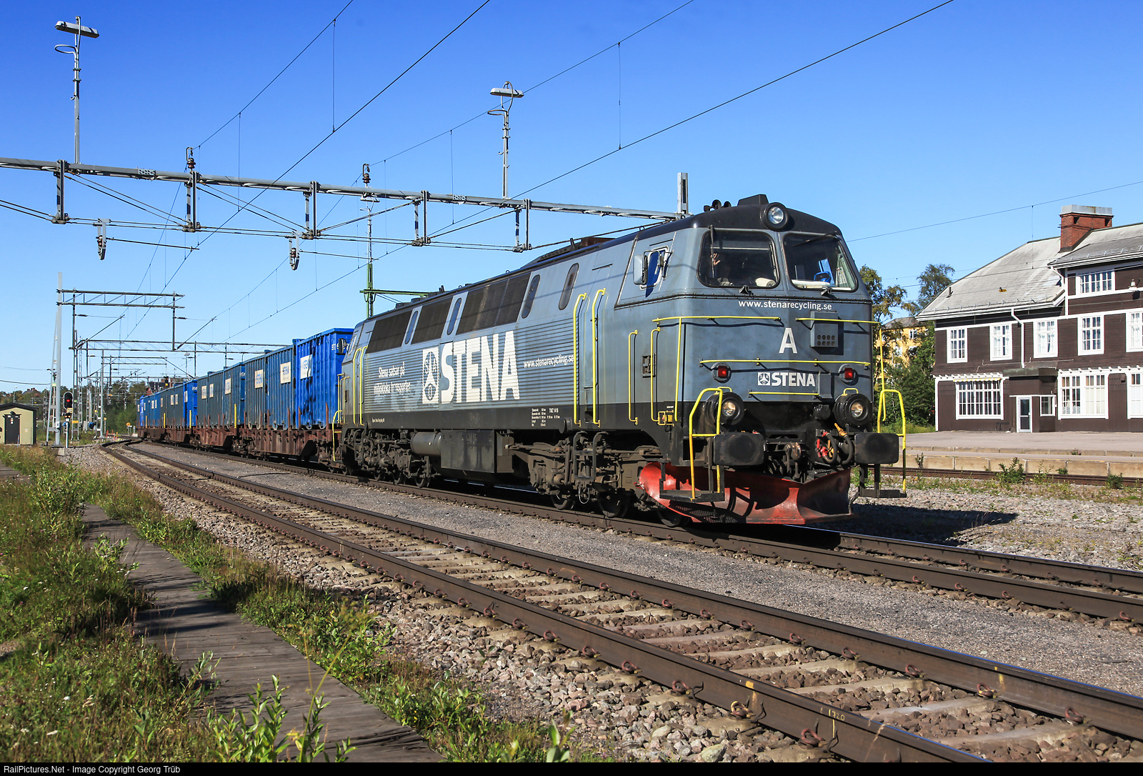 | 2500 kW diesellocomitve TMZ # 1416 of the Stena, former MZ # 1416 of the DSB (Danish State Railway), is leaving Kiruna with a container train towards Gällivare-Boden. |